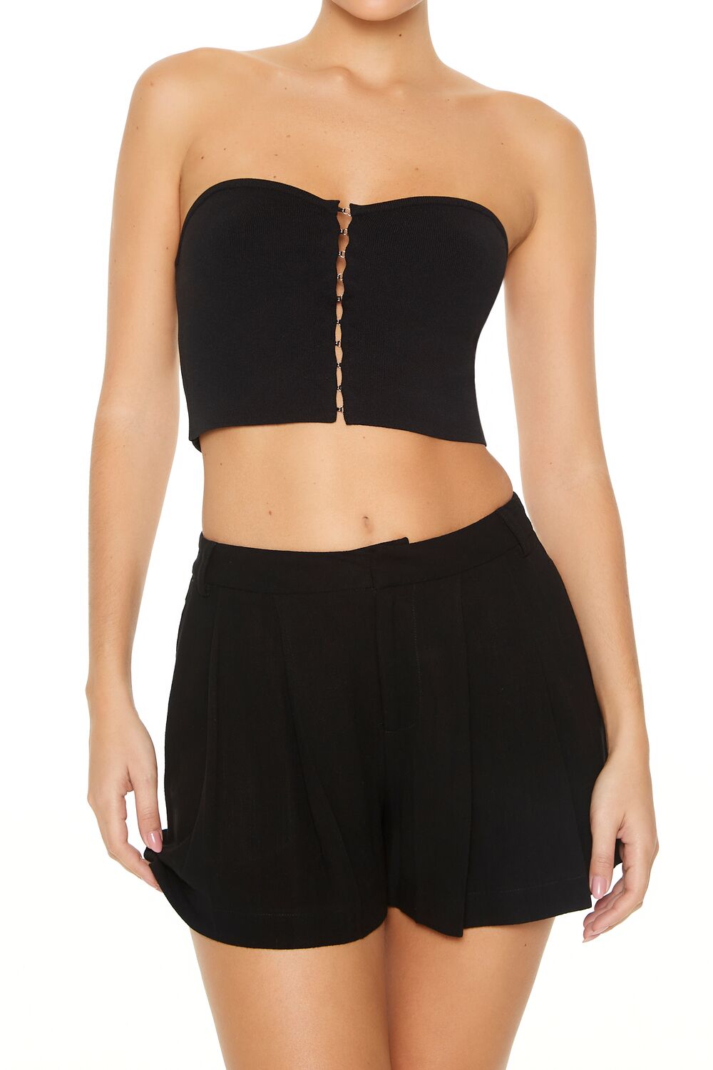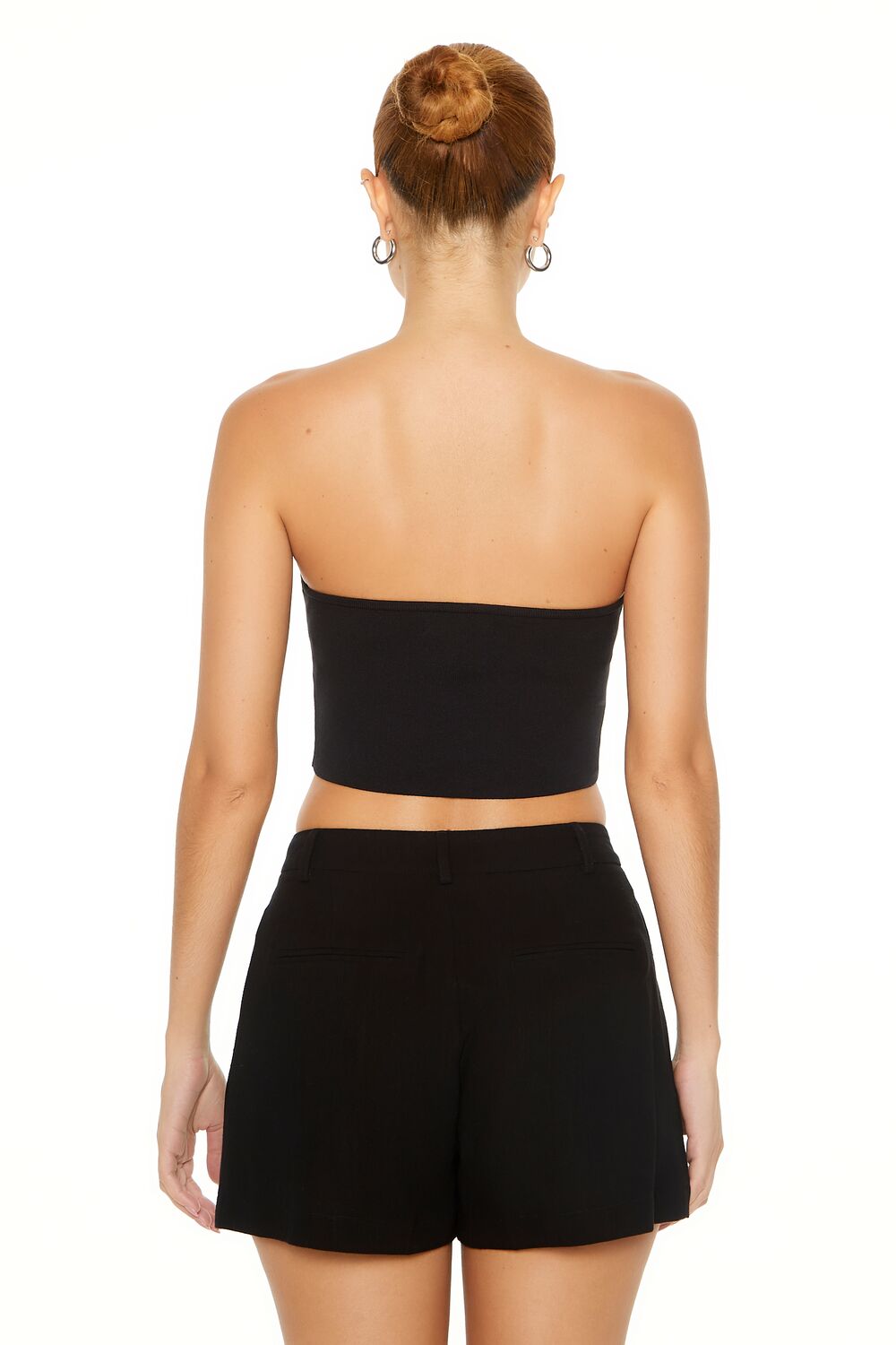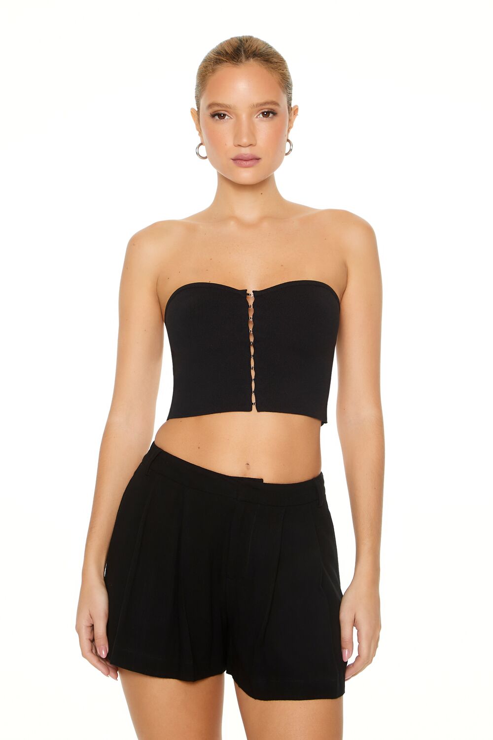 A sweater-knit tube top featuring a straight-cut neckline and back. ladder trim with high-polish details. and a cropped hem.