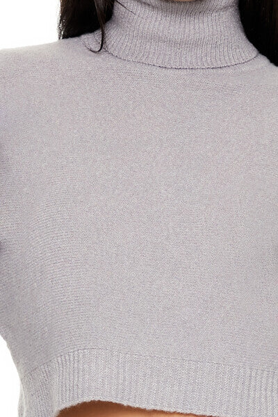 A knit sweater featuring a turtleneck. long sleeves. and a cropped hem.