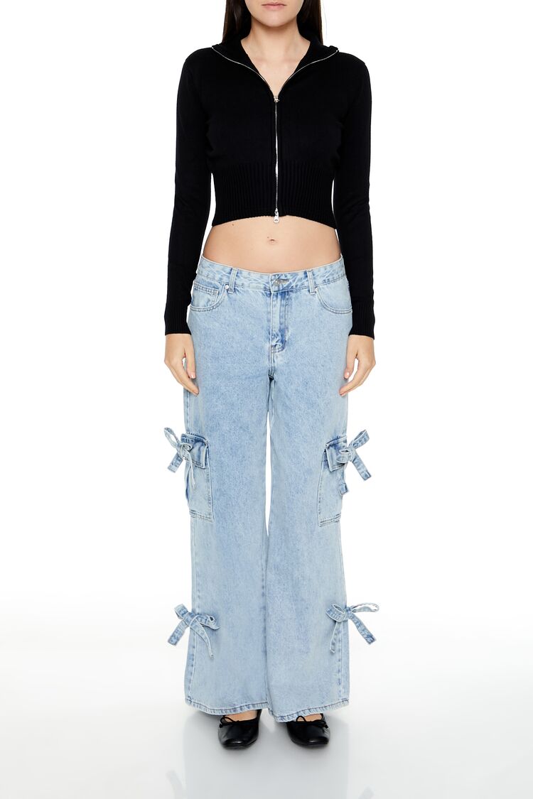 A knit sweater featuring a zip-up front closure. long sleeves. ribbed trim. a funnel neck. and cropped hem.