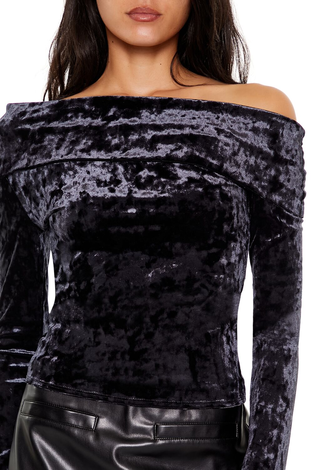 A crushed velvet top featuring a foldover off-the-shoulder neckline. long sleeves. and a semi-cropped hem.