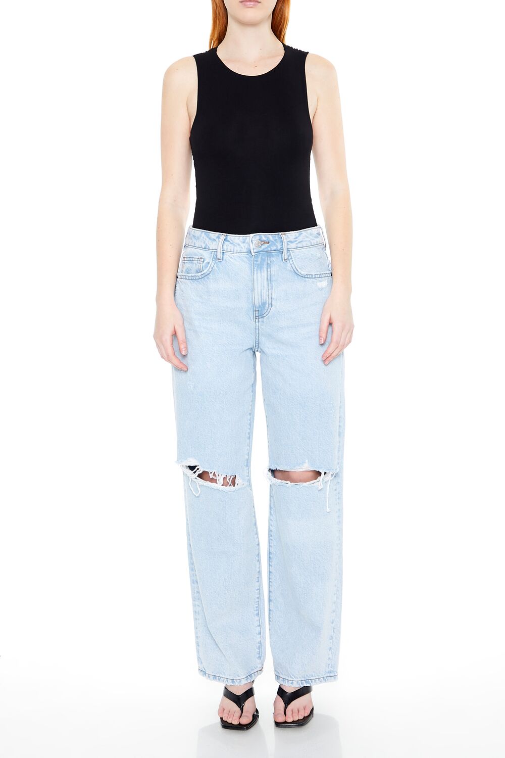 A jersey knit tank bodysuit featuring a round neckline. back cutout with twist design. and snap-button closures.