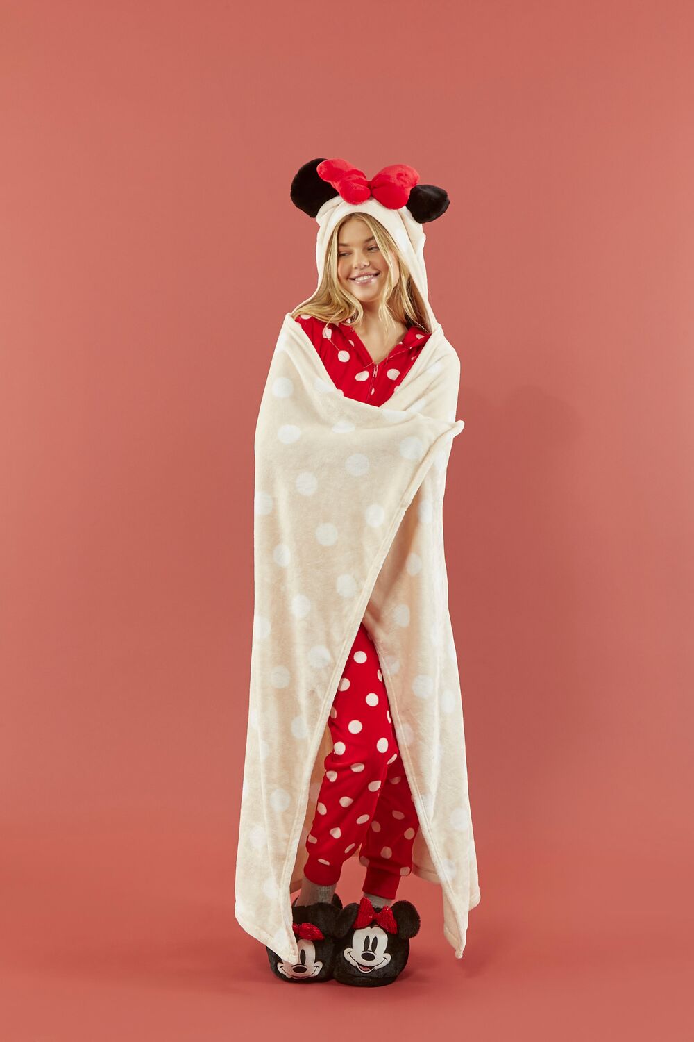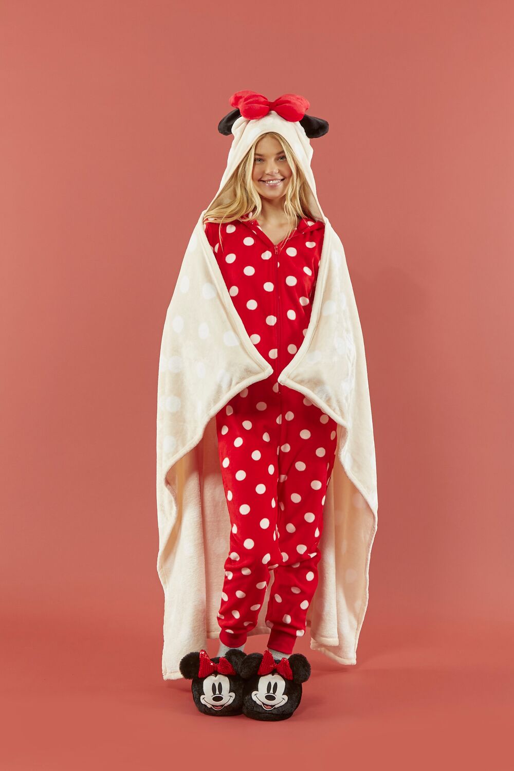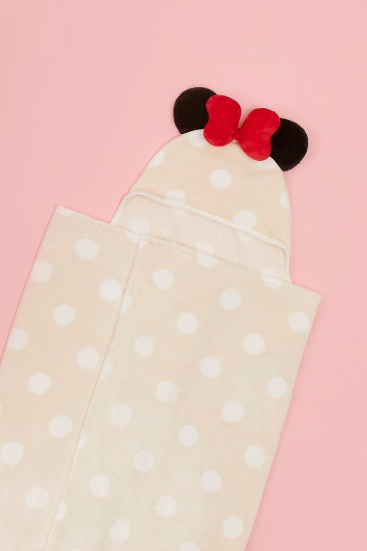 From our Disney x Forever 21 collection. this plush throw blanket features an allover polka dot pattern. hood. Minnie Mouse design. and protruding bow and ears.