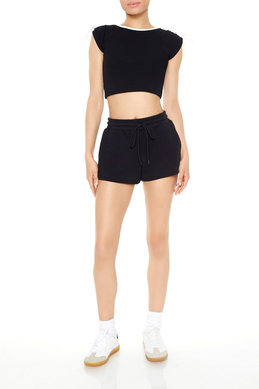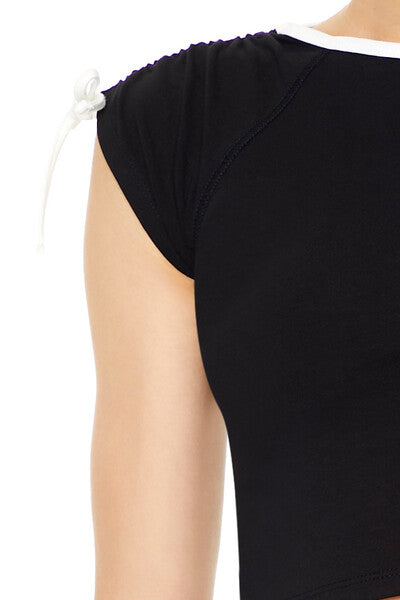 A knit tee featuring contrasting round neckline. raglan cap sleeves. drawstrings at the shoulders. and a cropped hem.