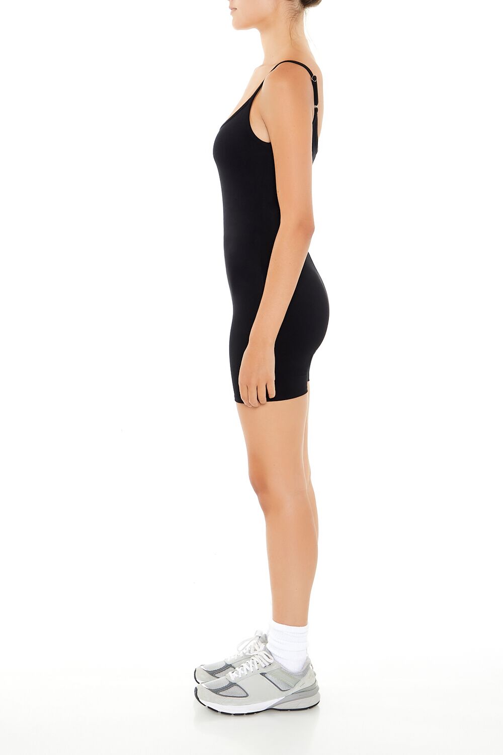 A jersey knit romper featuring a scoop neckline and back. fixed cami straps. and fitted silhouette.