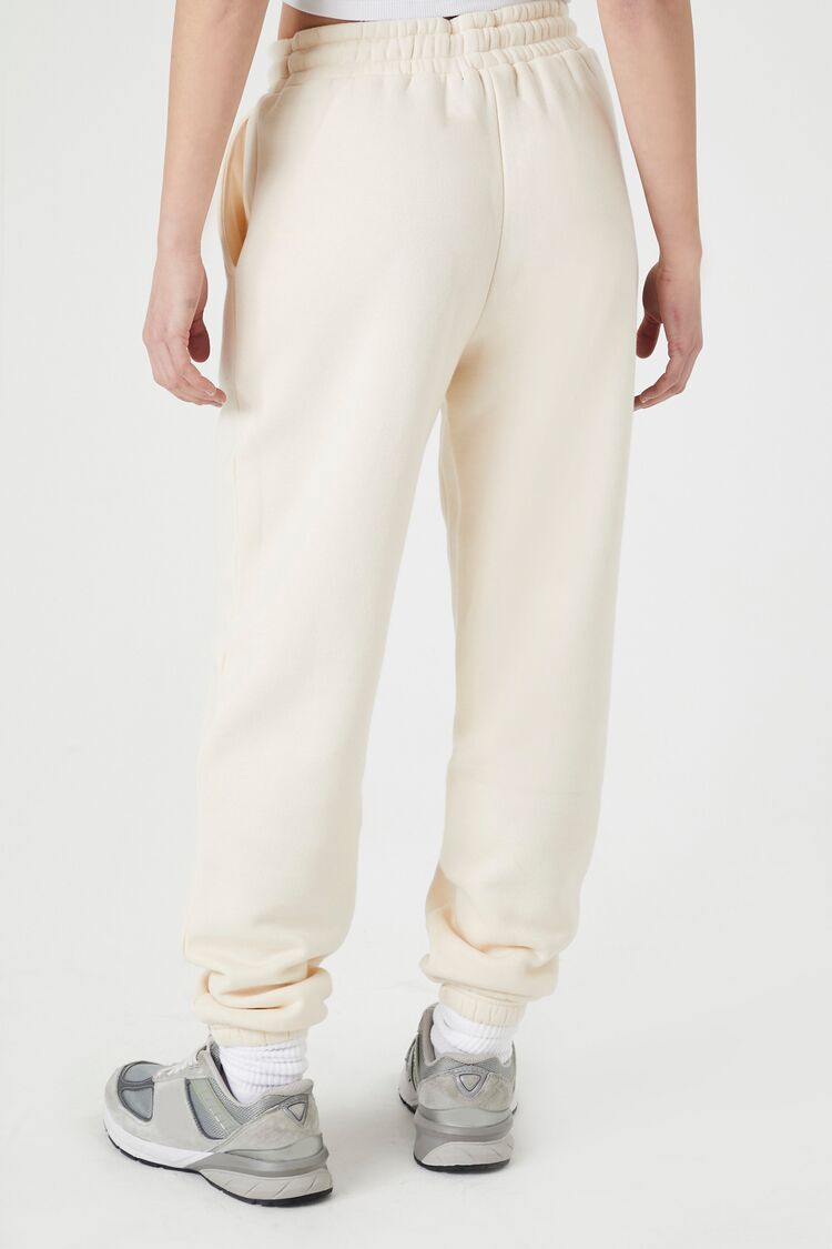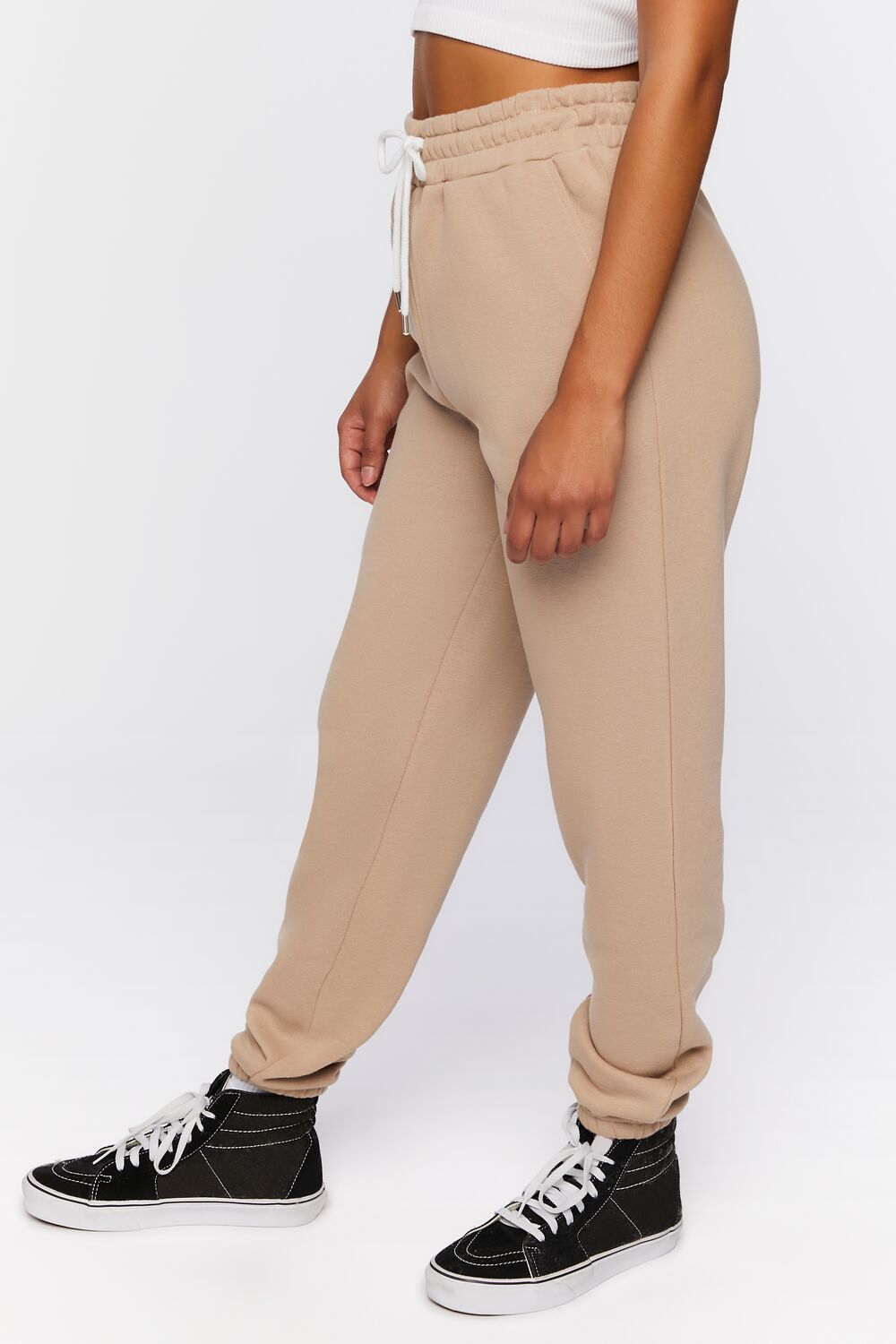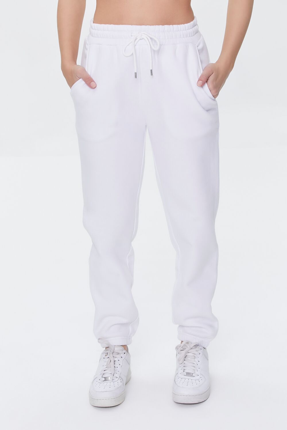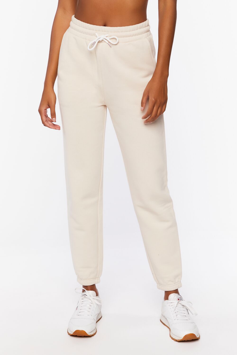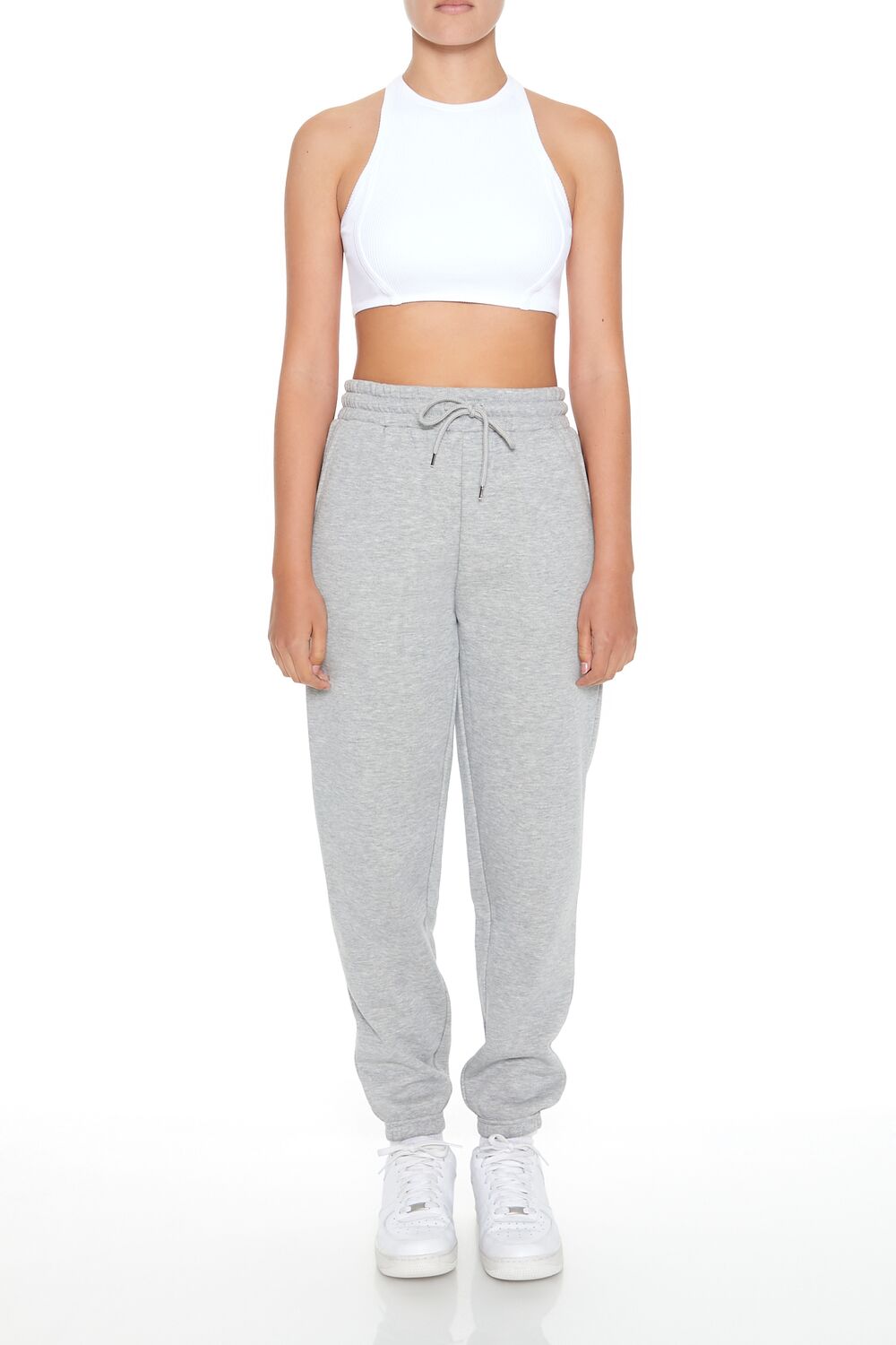 A pair of fleece joggers featuring a drawstring high-rise waist. slanted front pockets. and elasticized trim.