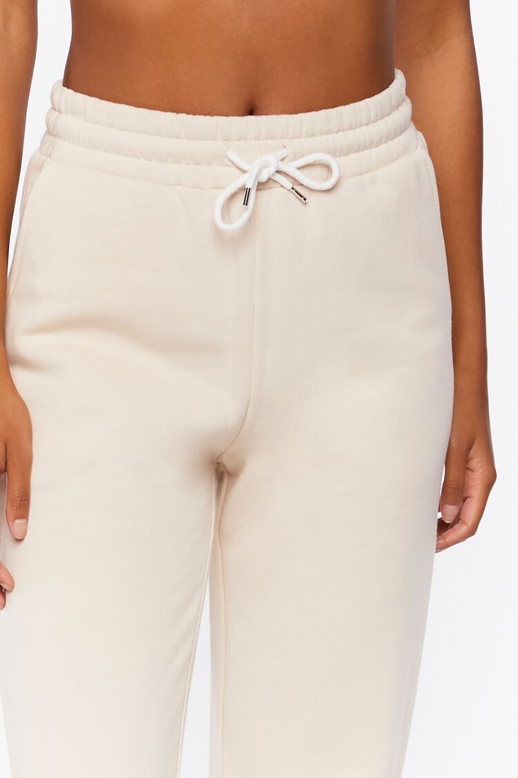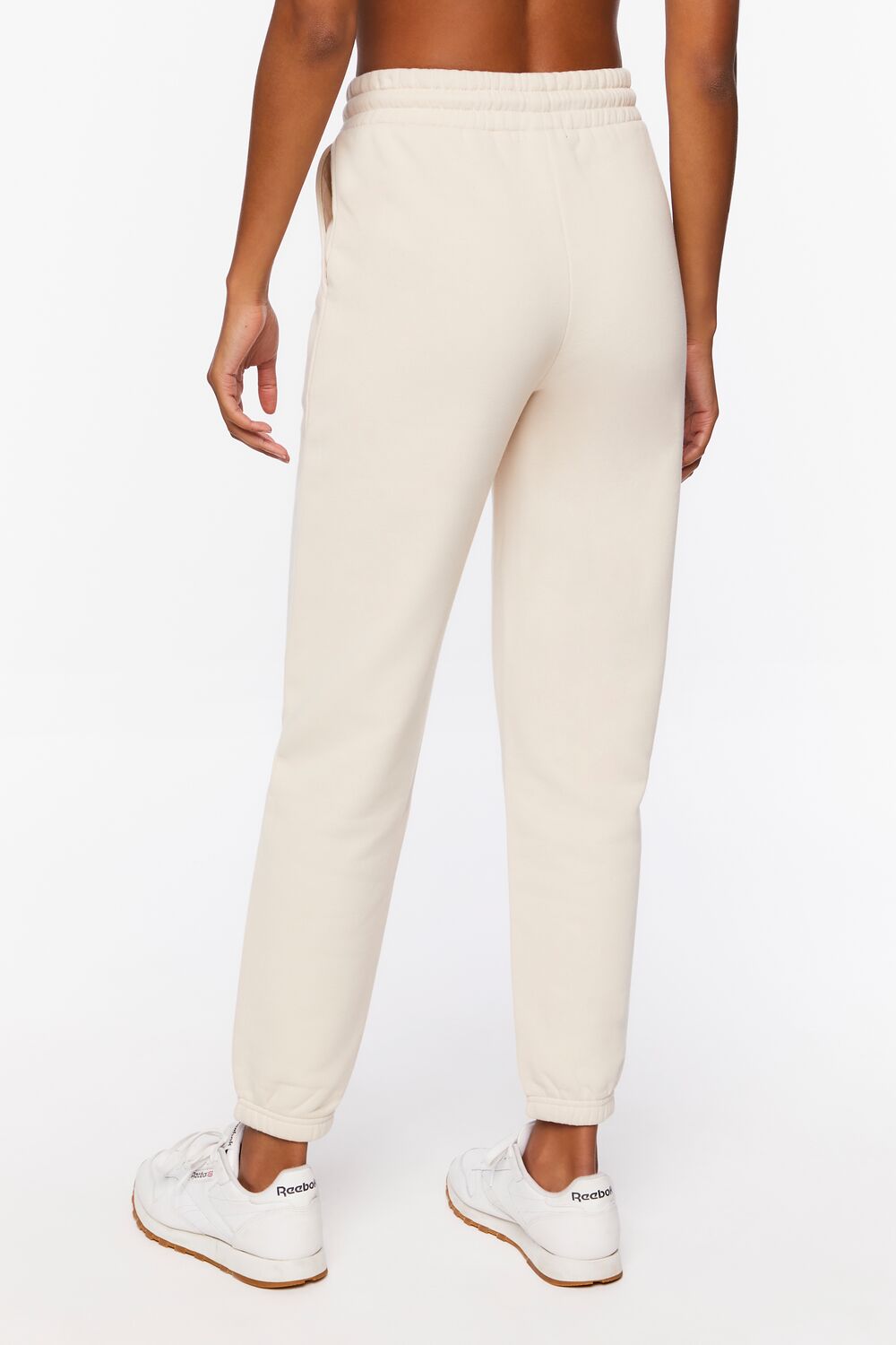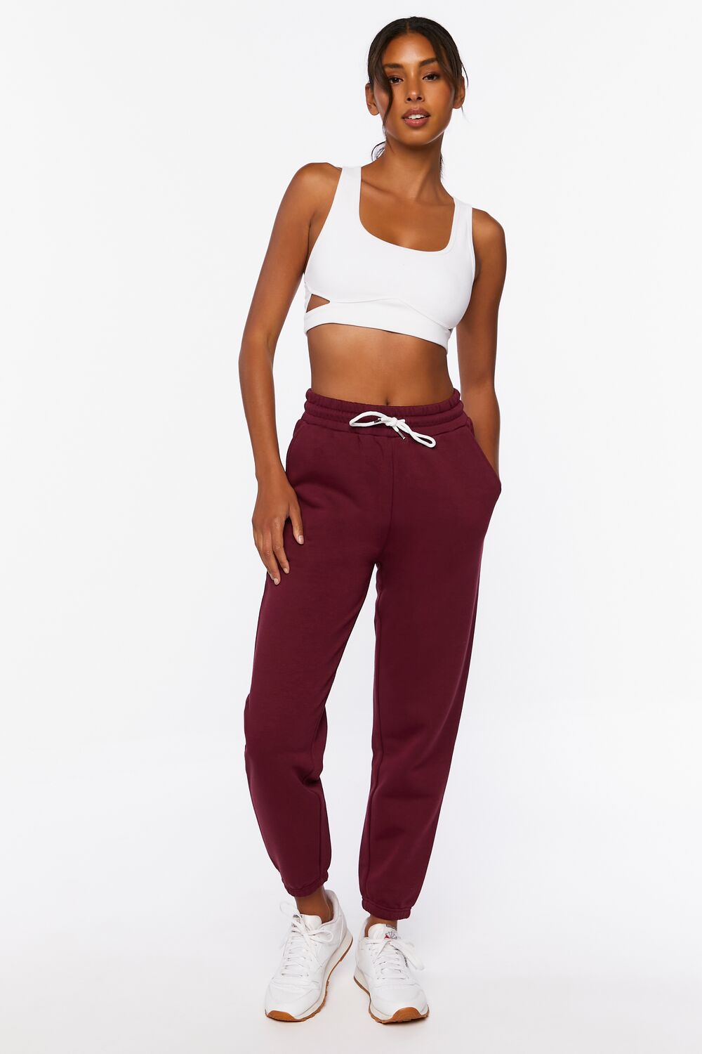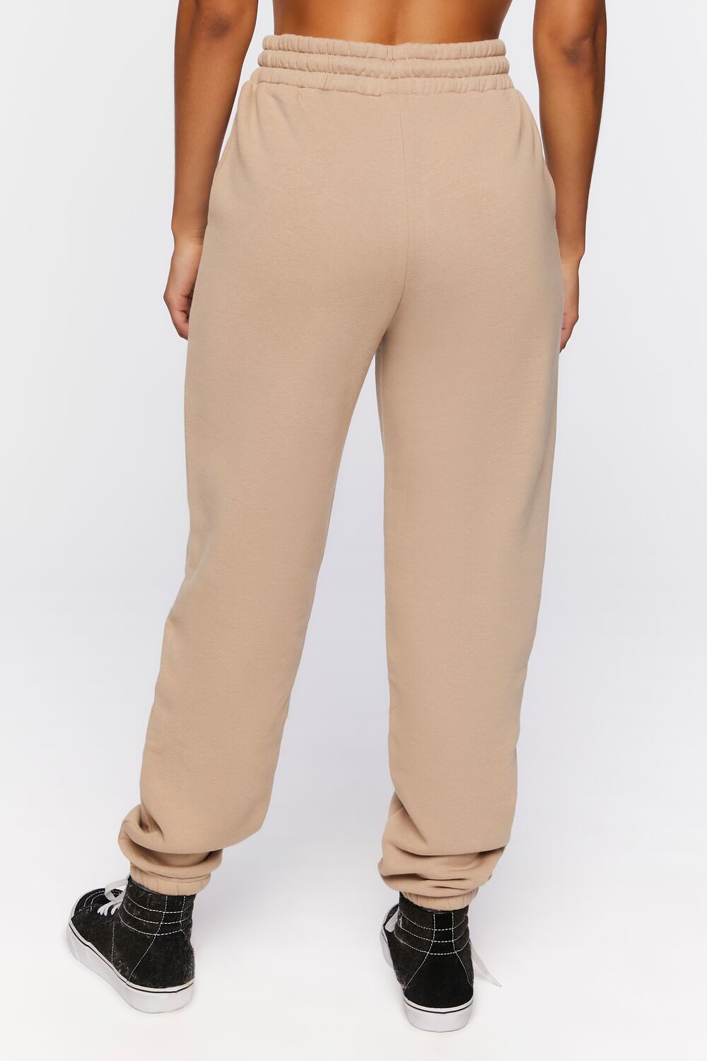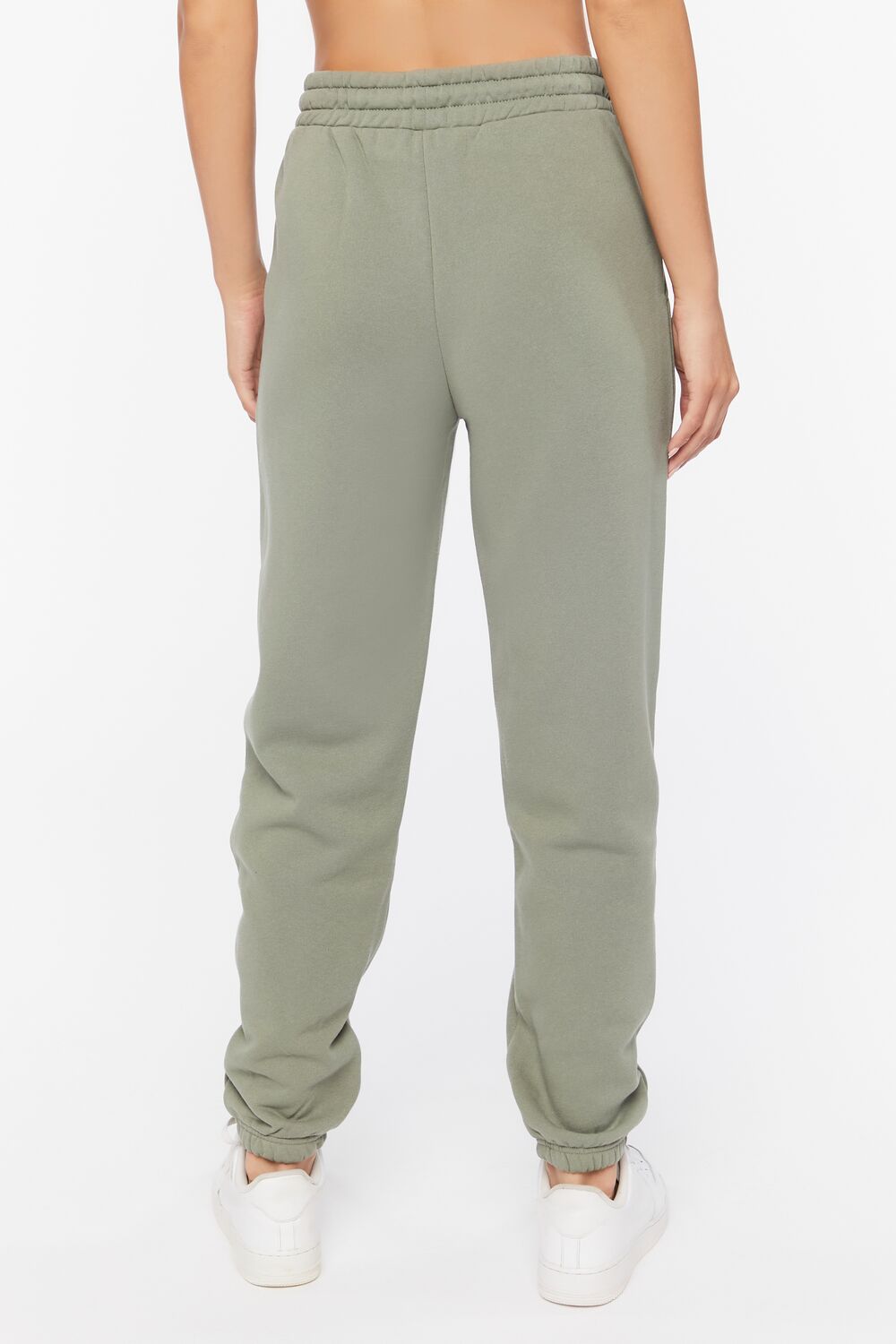 A pair of fleece joggers featuring a drawstring high-rise waist. slanted front pockets. and elasticized trim.
