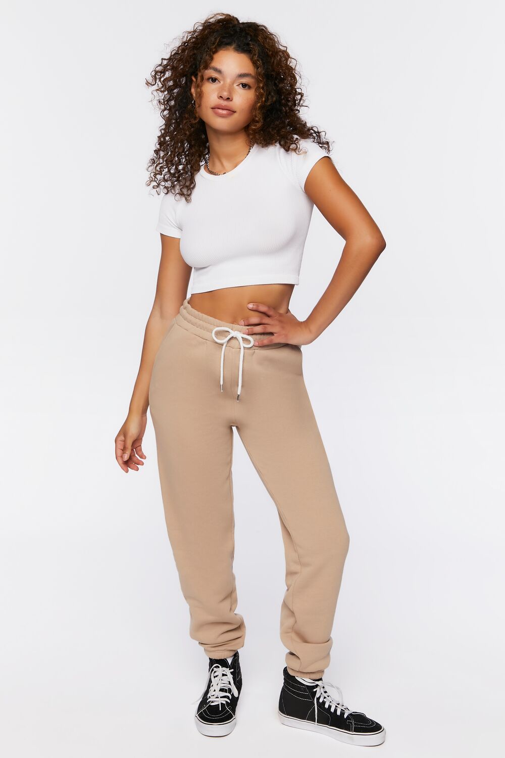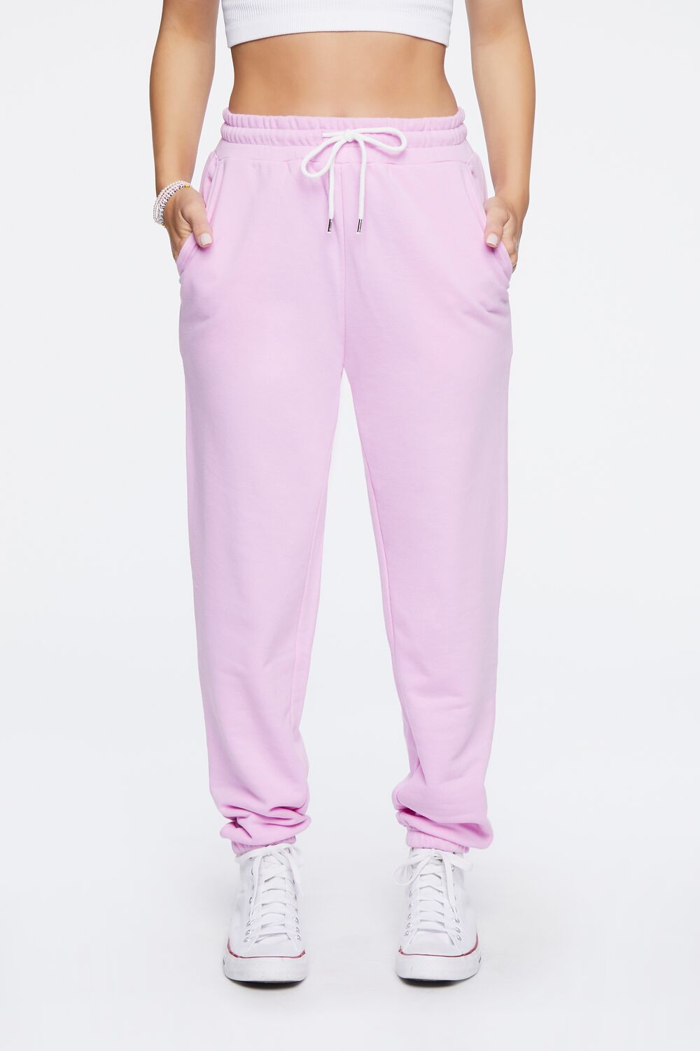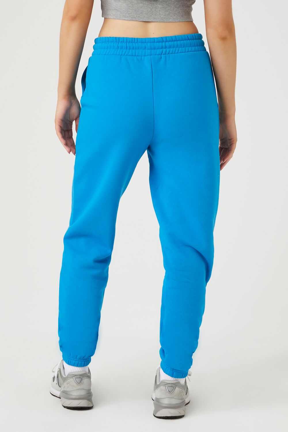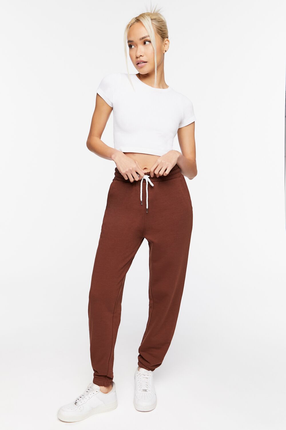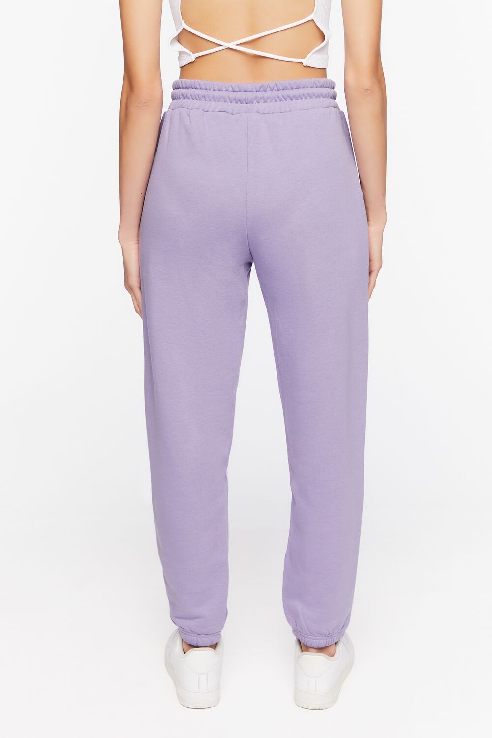 A pair of fleece joggers featuring a drawstring high-rise waist. slanted front pockets. and elasticized trim.