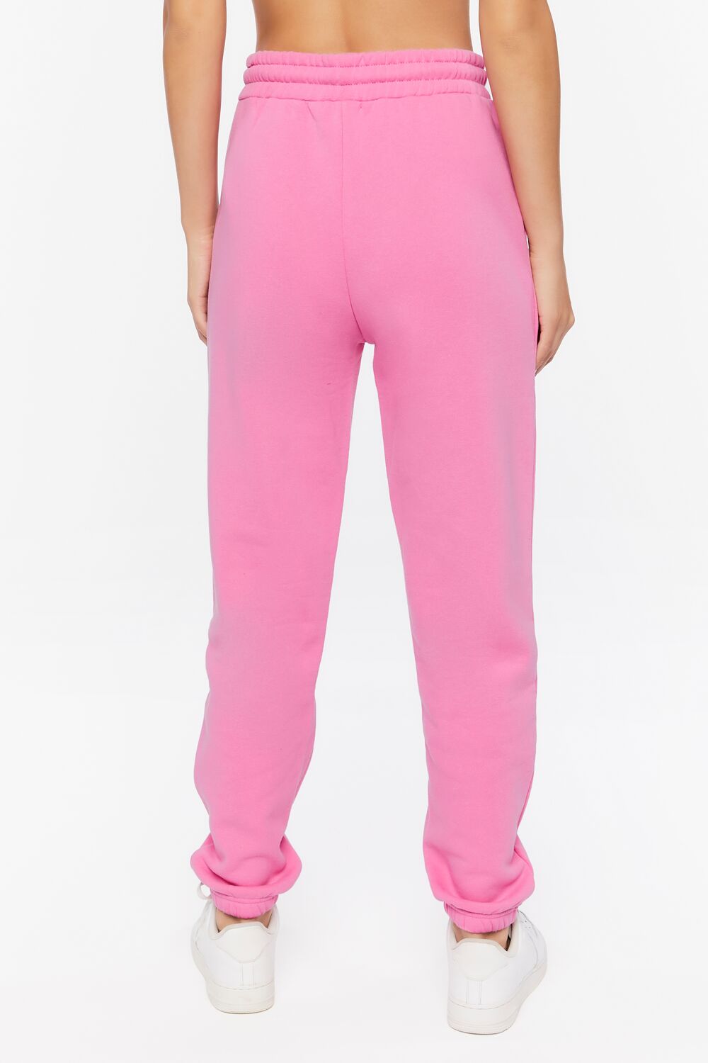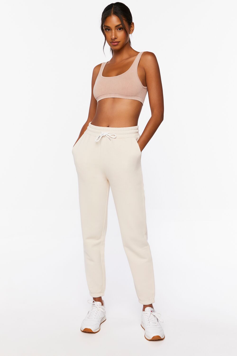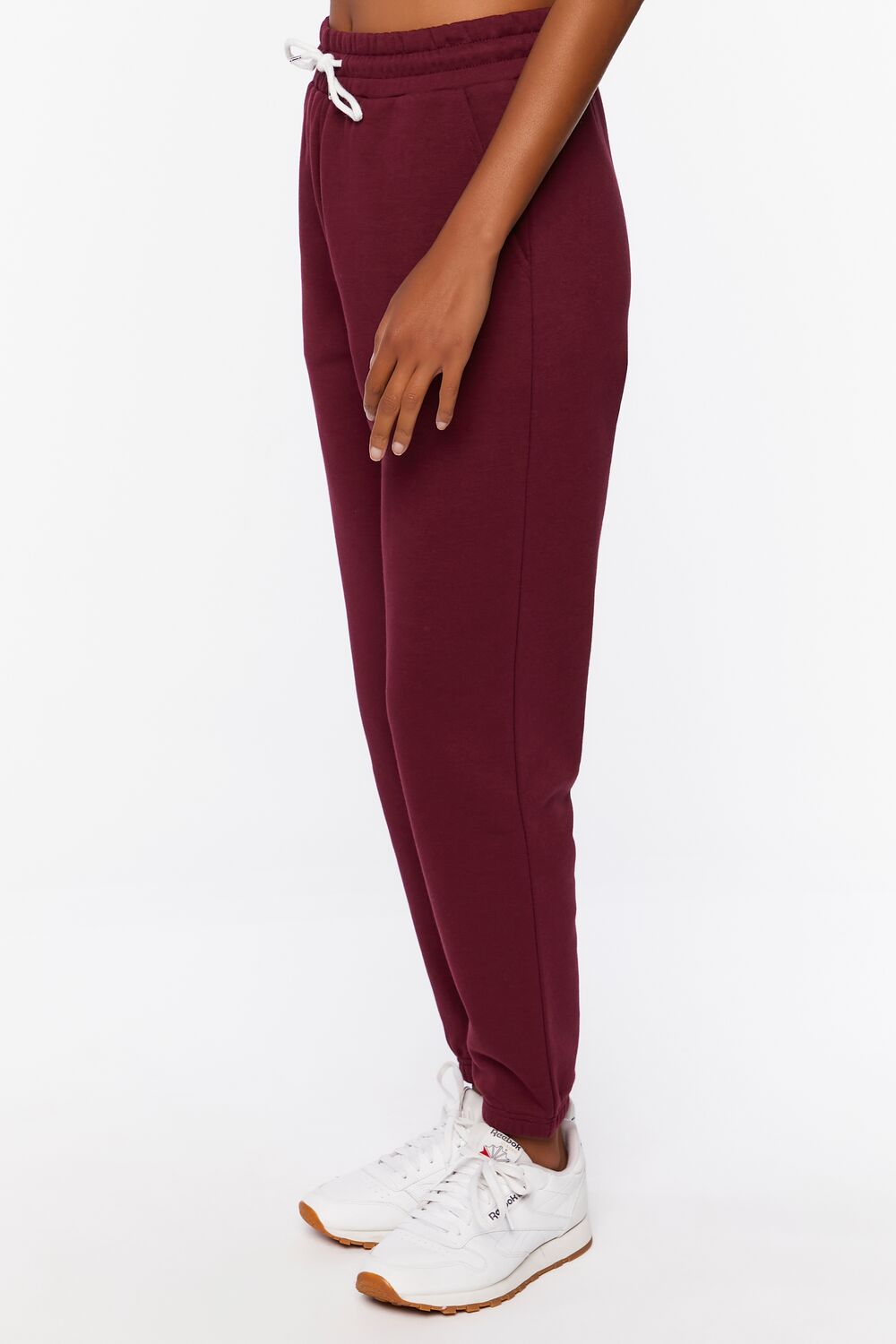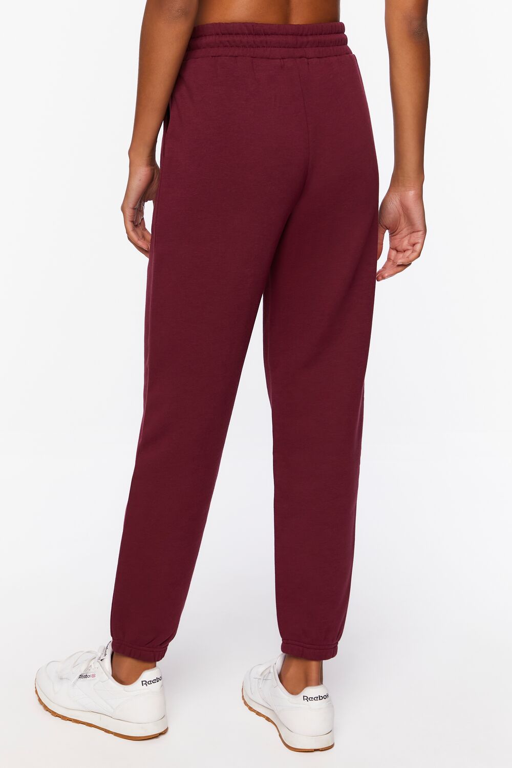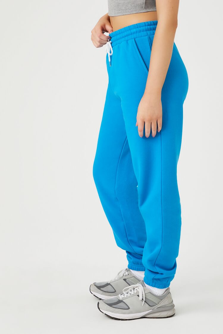 A pair of fleece joggers featuring a drawstring high-rise waist. slanted front pockets. and elasticized trim.