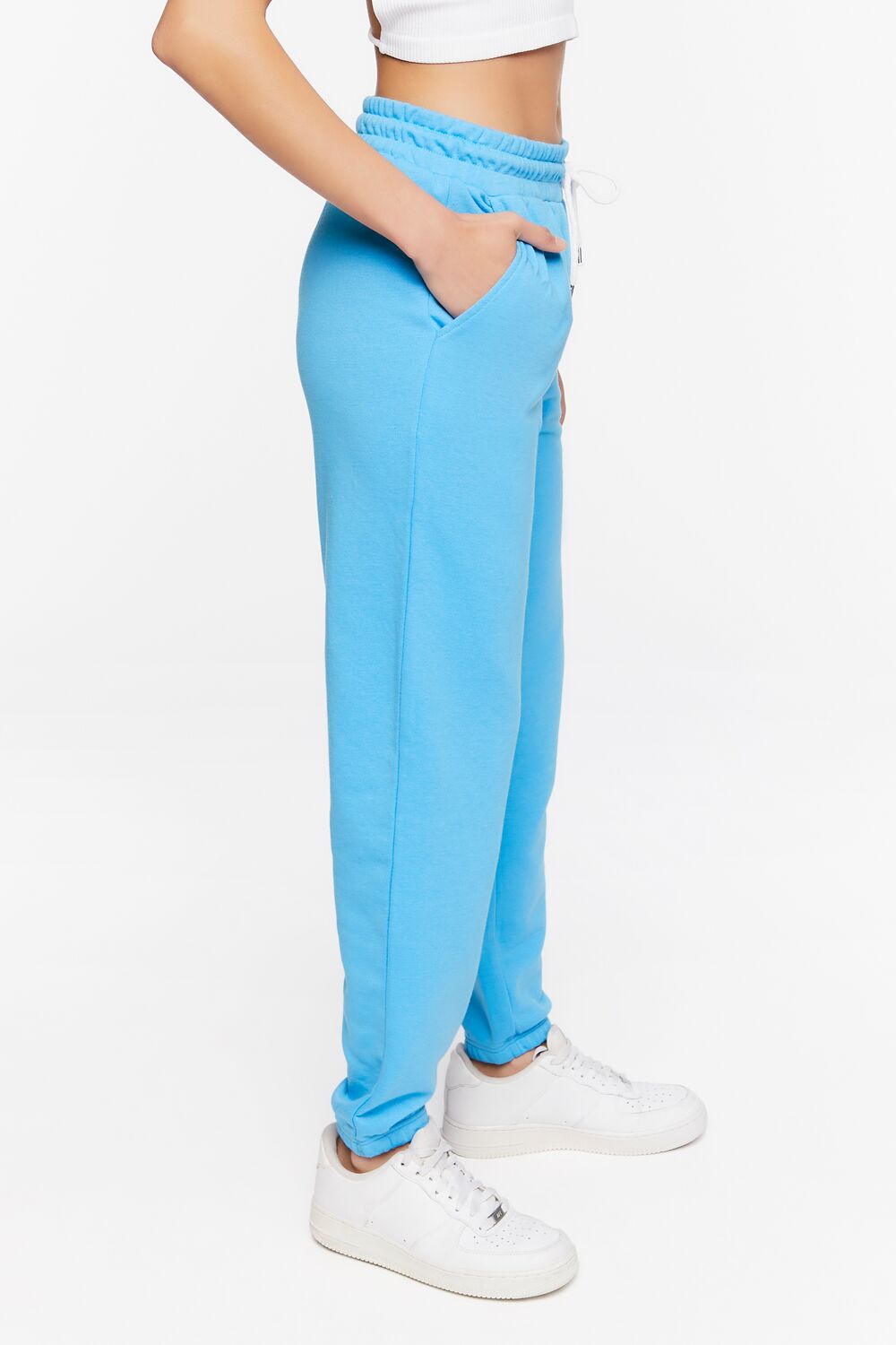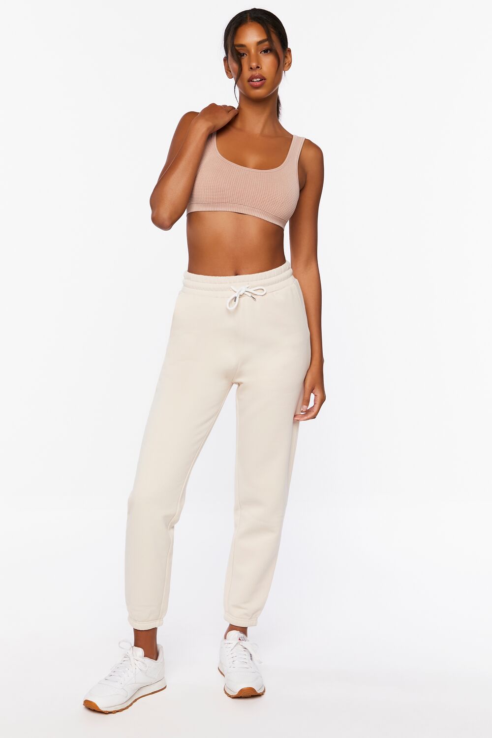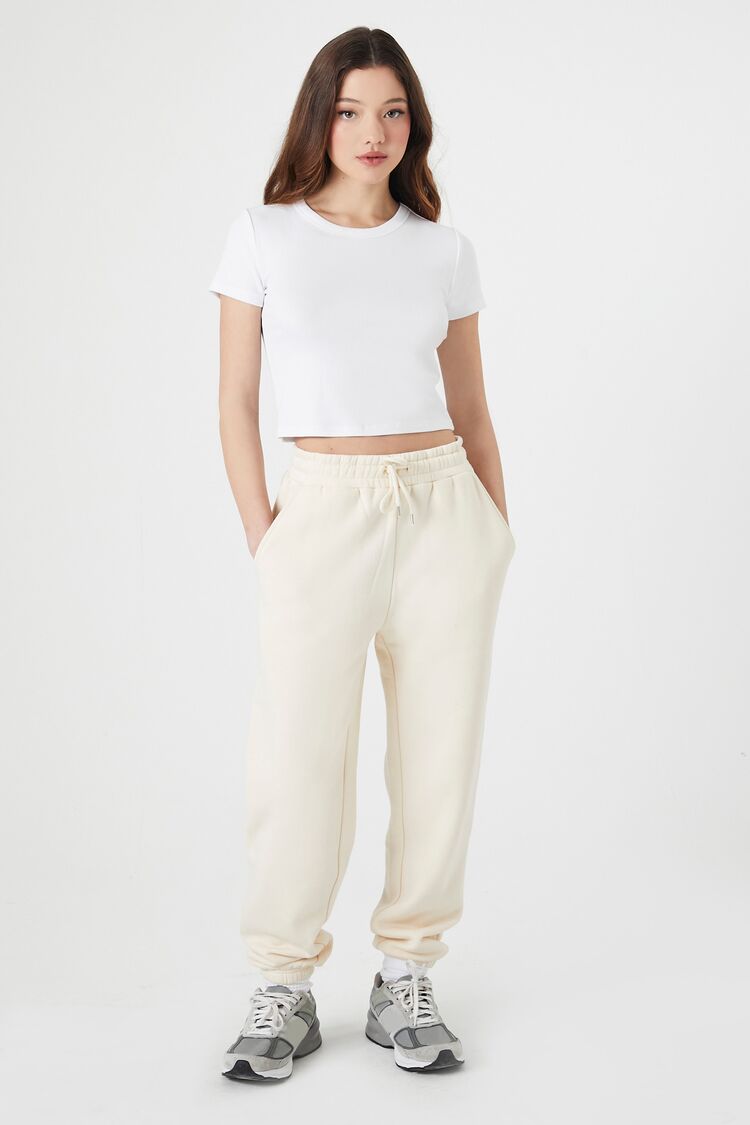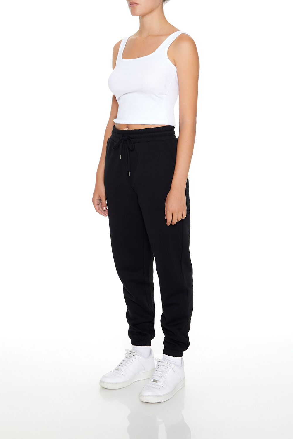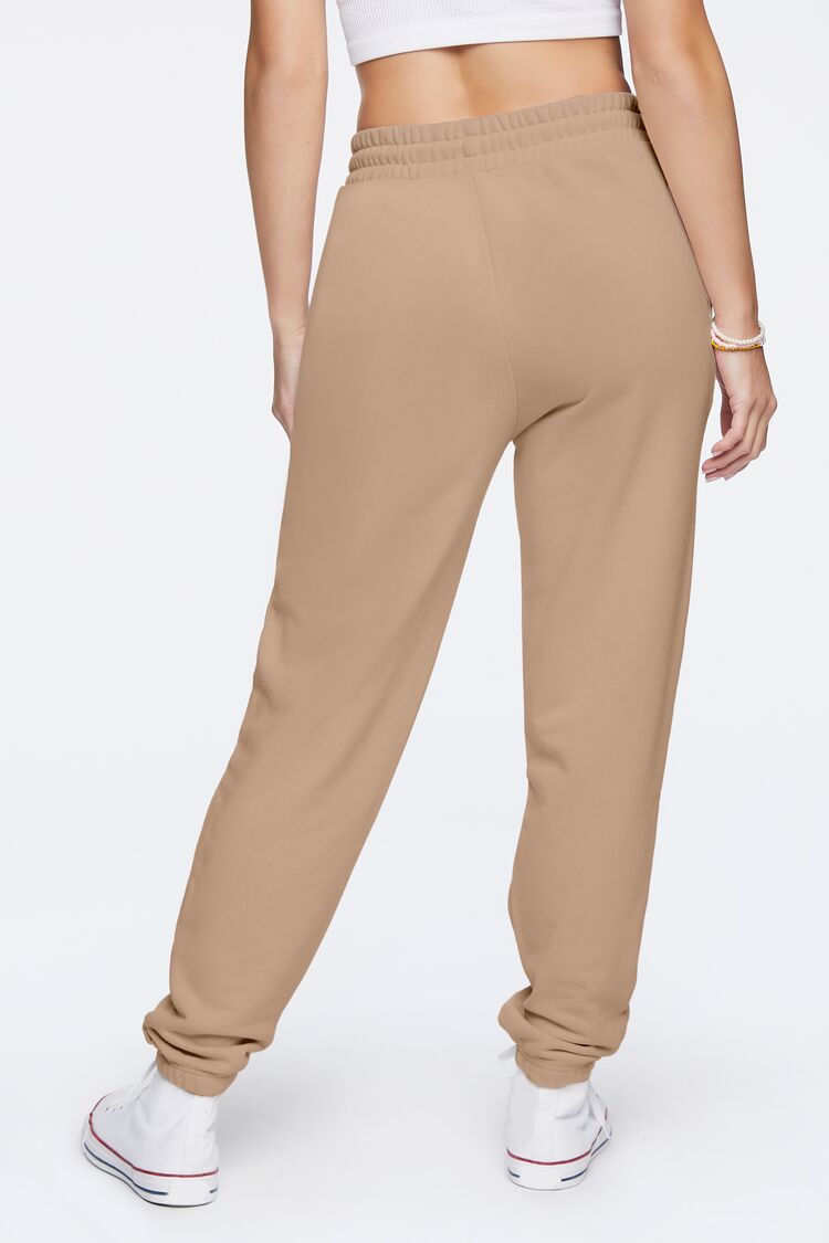 A pair of fleece joggers featuring a drawstring high-rise waist. slanted front pockets. and elasticized trim.
