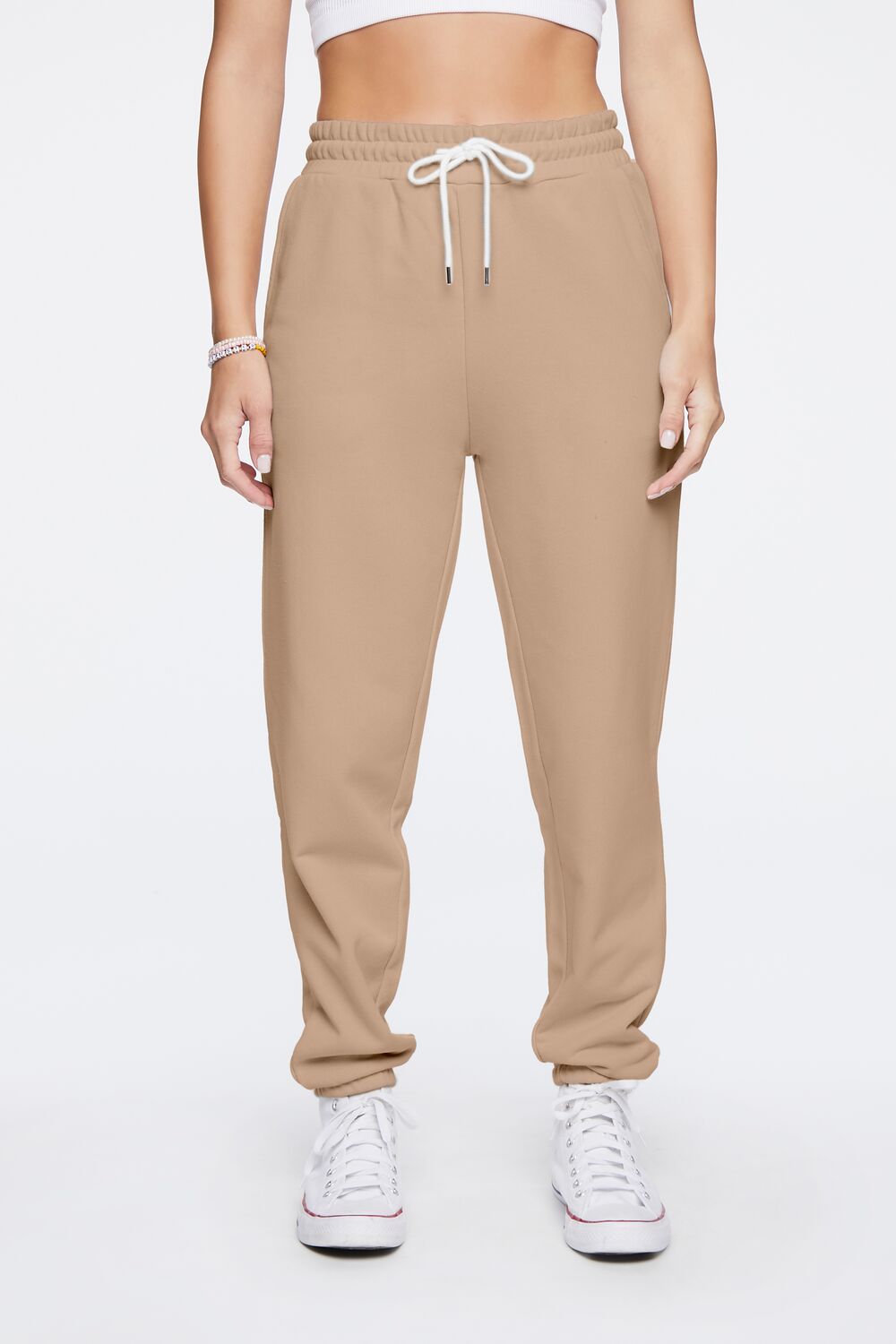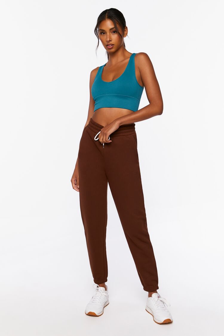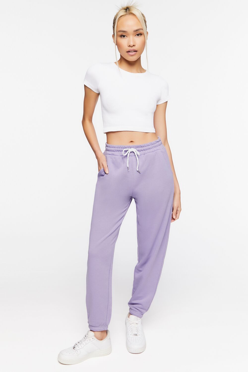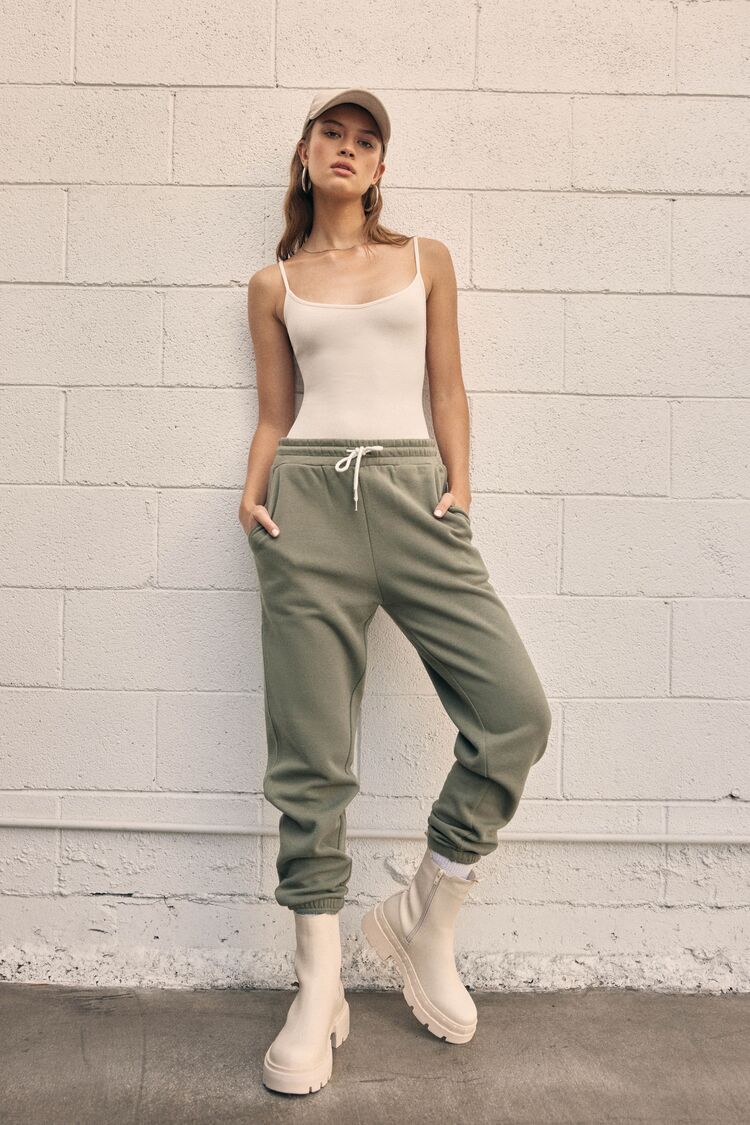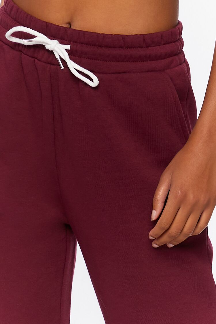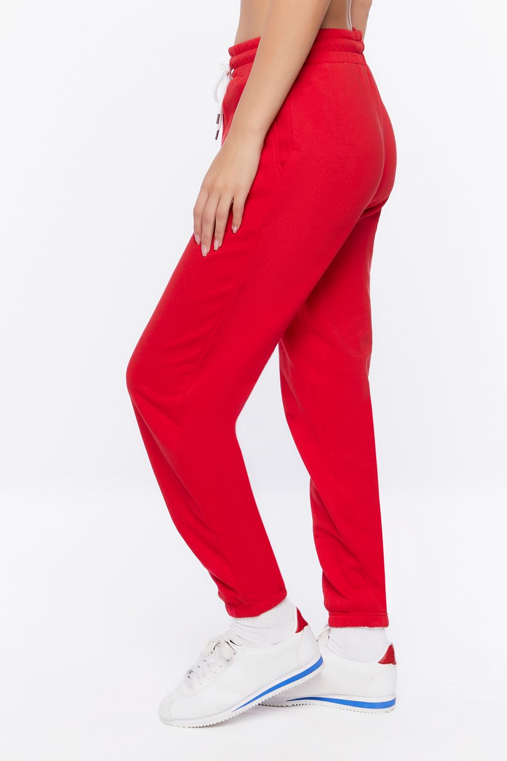 A pair of fleece joggers featuring a drawstring high-rise waist. slanted front pockets. and elasticized trim.