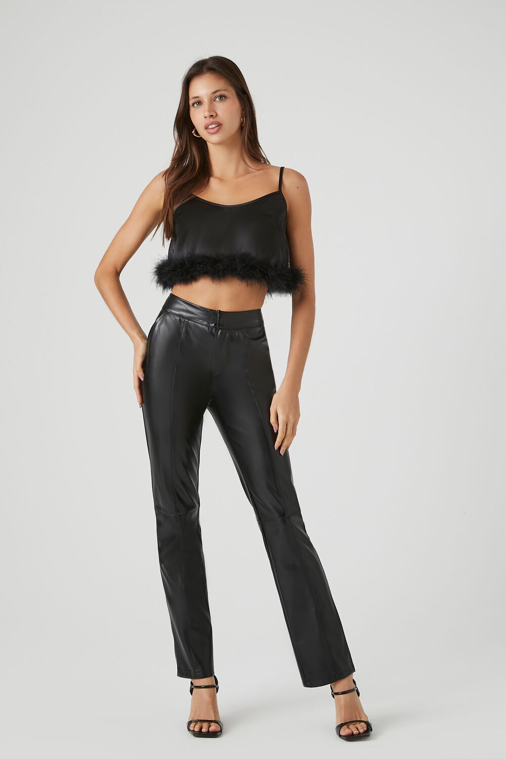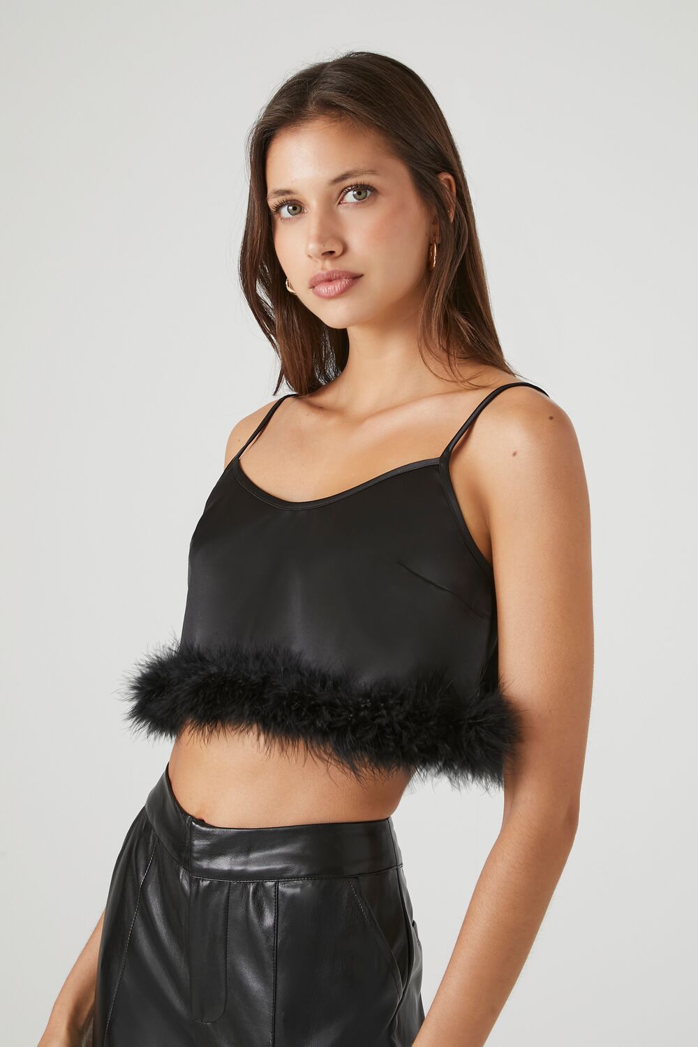A satin cropped cami featuring a V-neckline. adjustable straps. and fur hem.