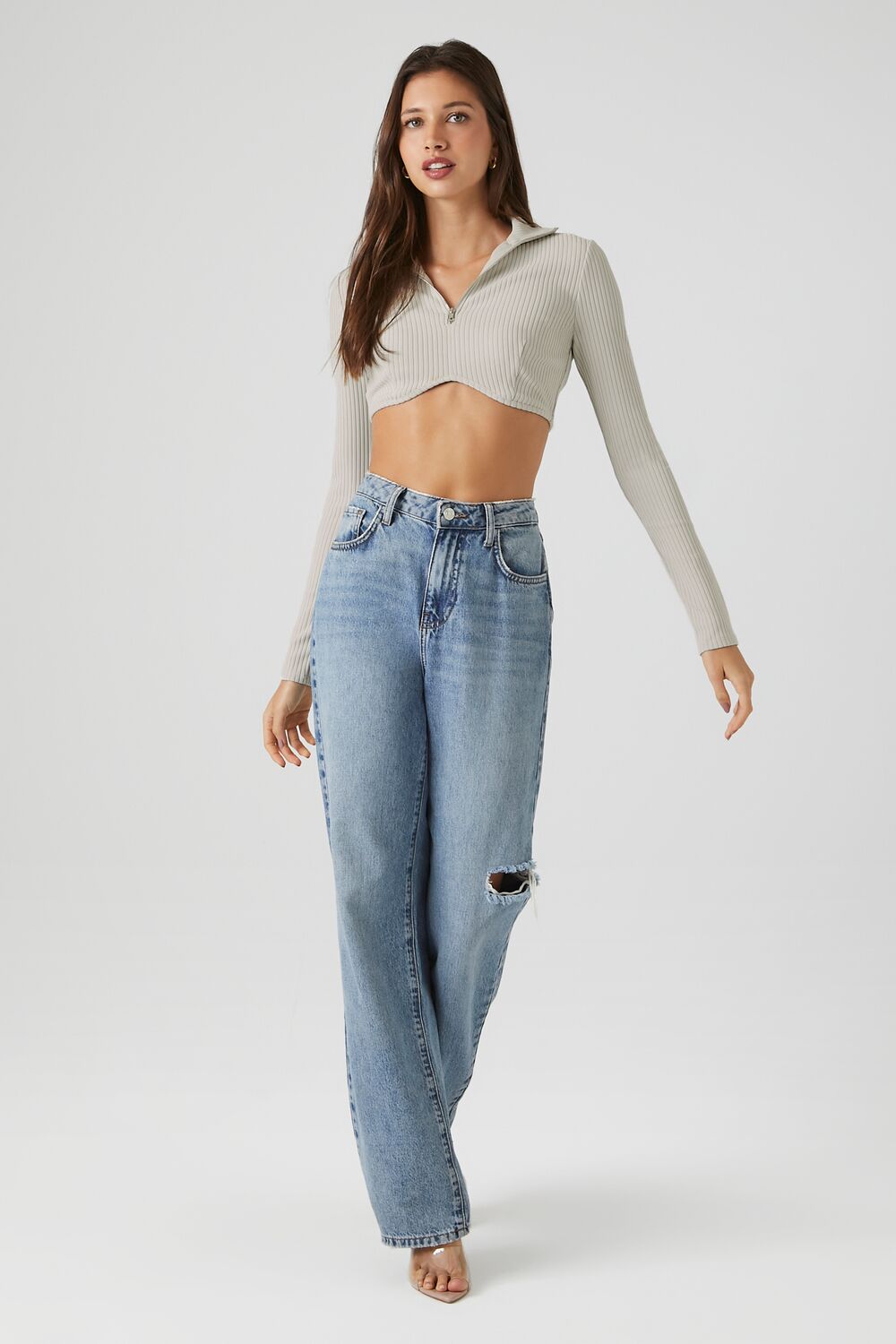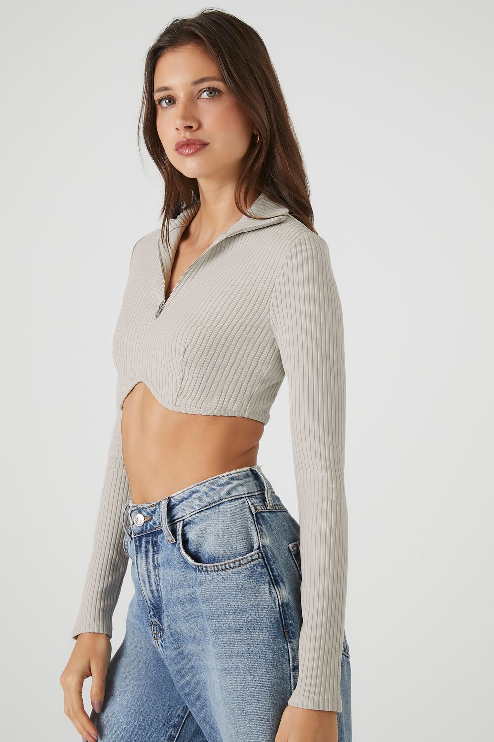 A ribbed knit crop top featuring a basic collar. half-zip closure. long sleeves. and a notched hem.