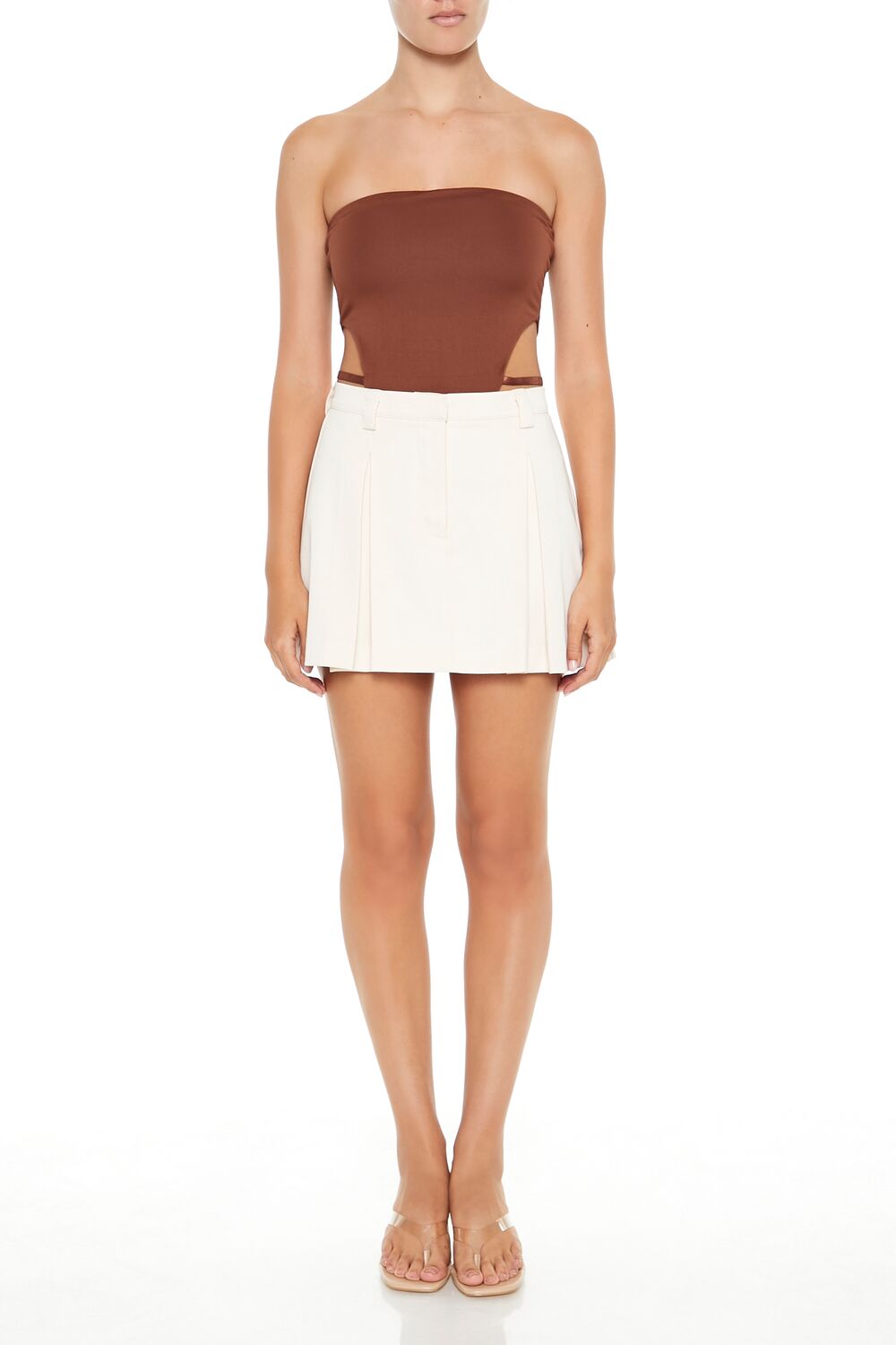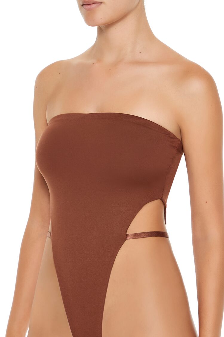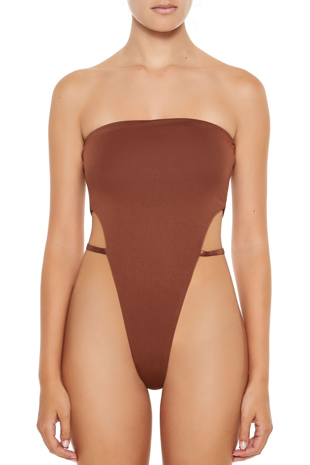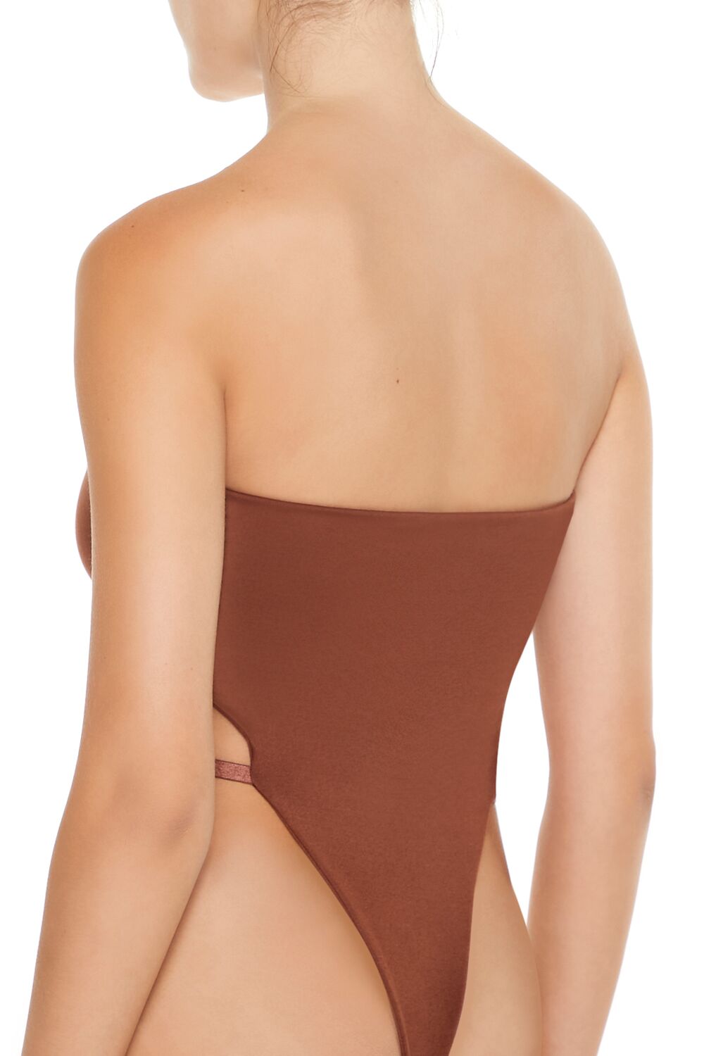 A knit tube bodysuit featuring a straight-cut neckline and back. side cutouts. high-leg cut. and thong bottom cut.