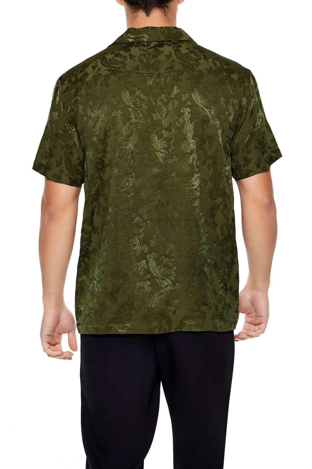 A woven jacquard shirt featuring an allover paisley print. Cuban collar. and short sleeves.