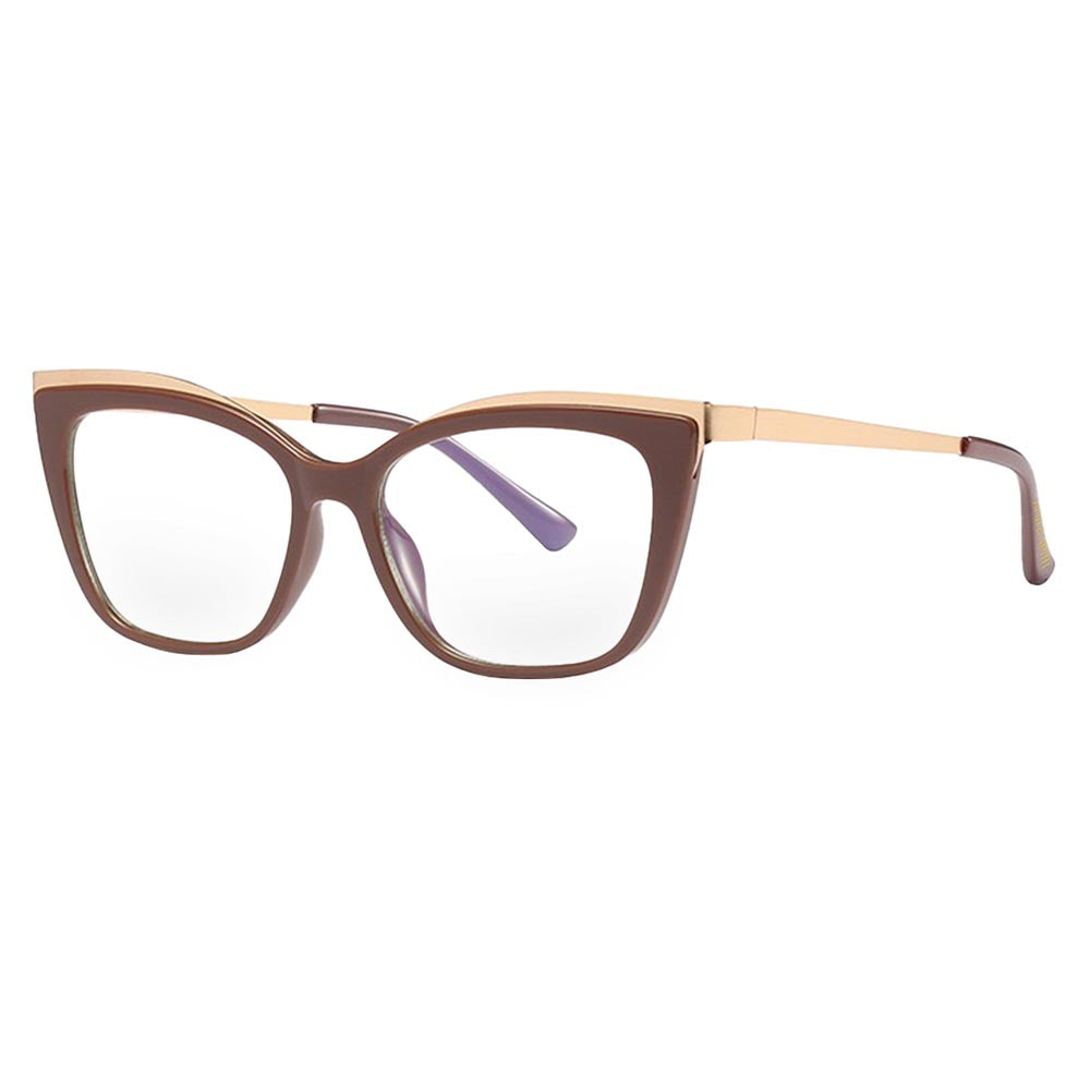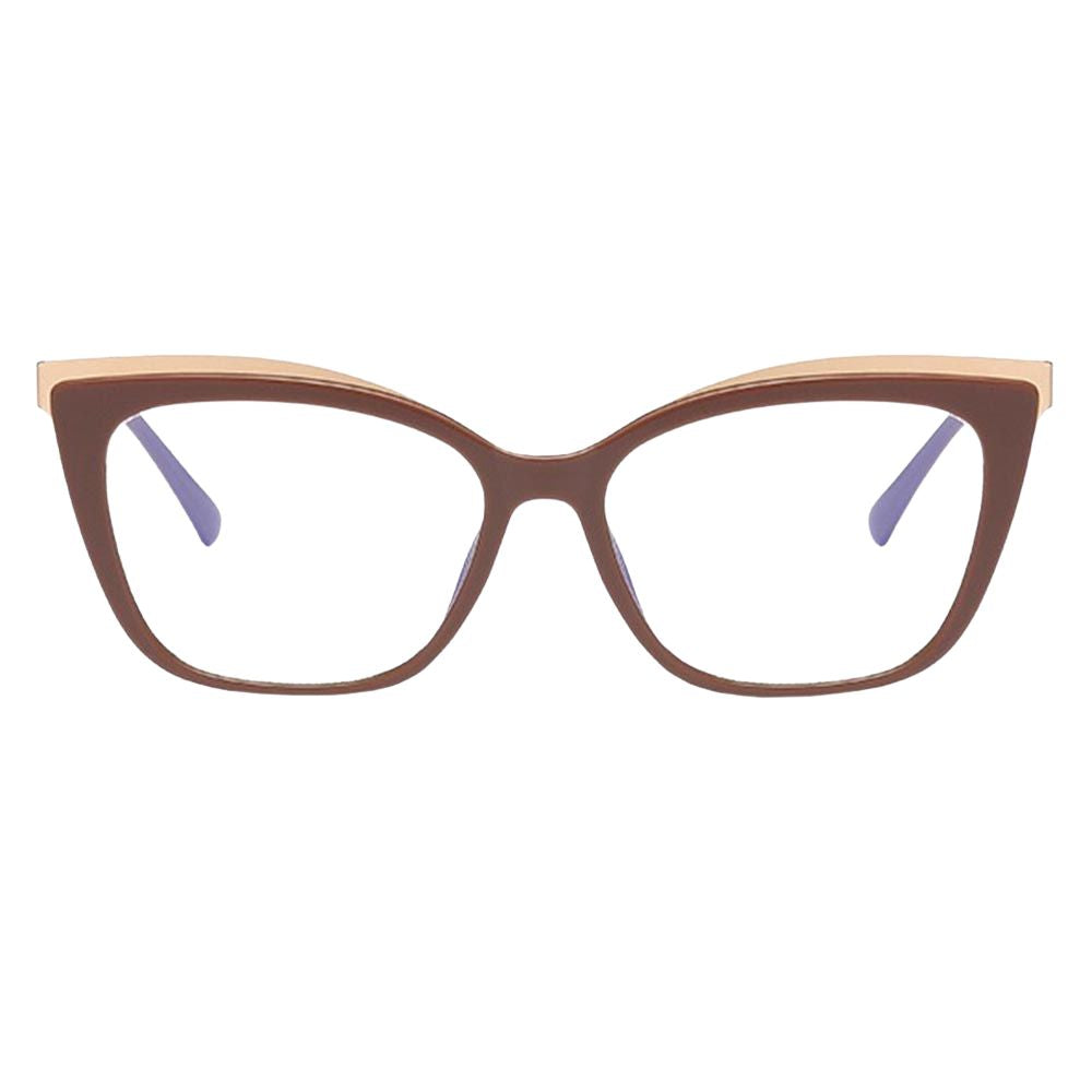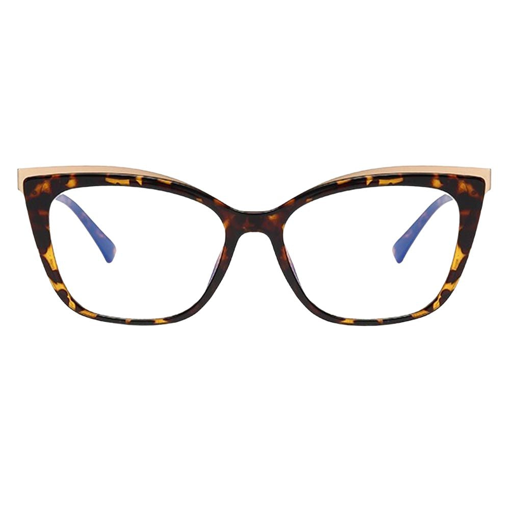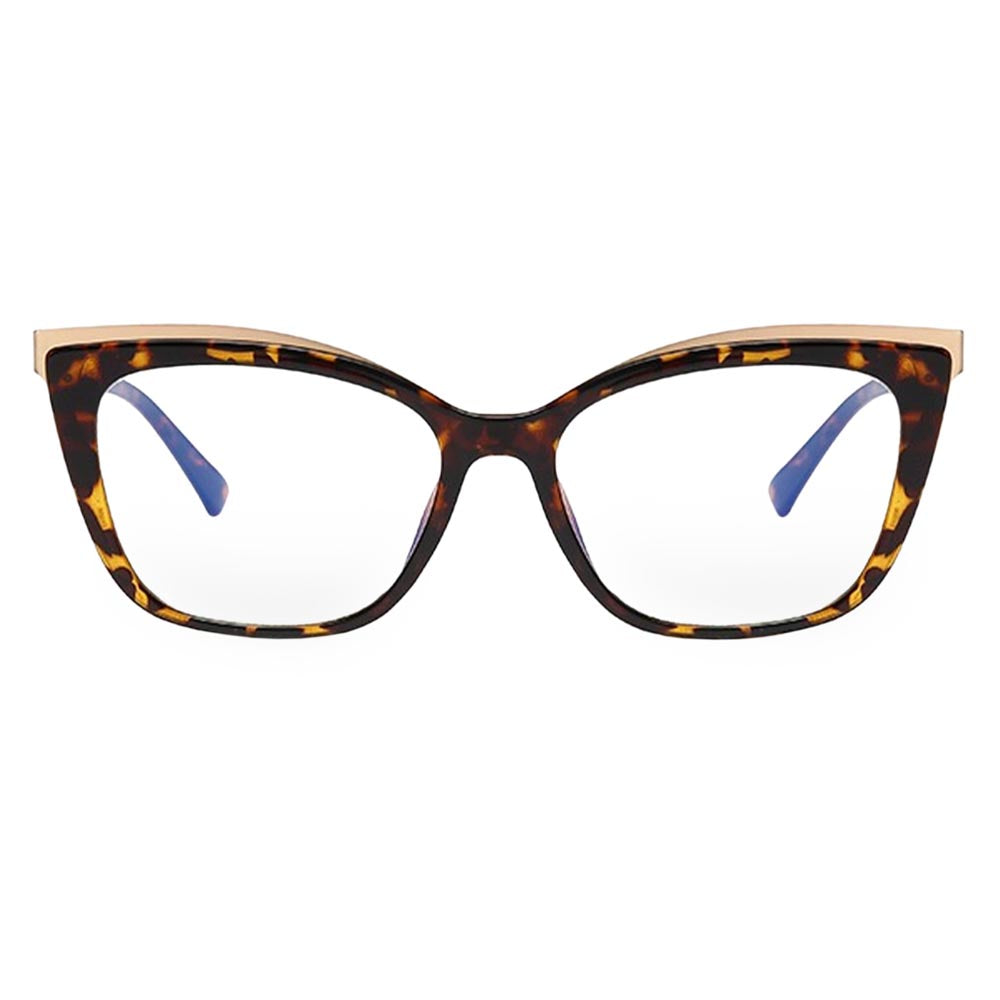 Introducing Jami blue light blocking glasses. a stylish blend of elegance and protection for your eyes. With chic cat-eye frames adorned with luxurious gold accents along the top of the lenses. Jami offers both fashion-forward flair and practicality. Available in classic black. timeless torte. or sophisticated brown. these glasses are not just an accessory but a shield against blue light emitted by screens. Say goodbye to eye strain and hello to style with Jami blue light blocking glasses.