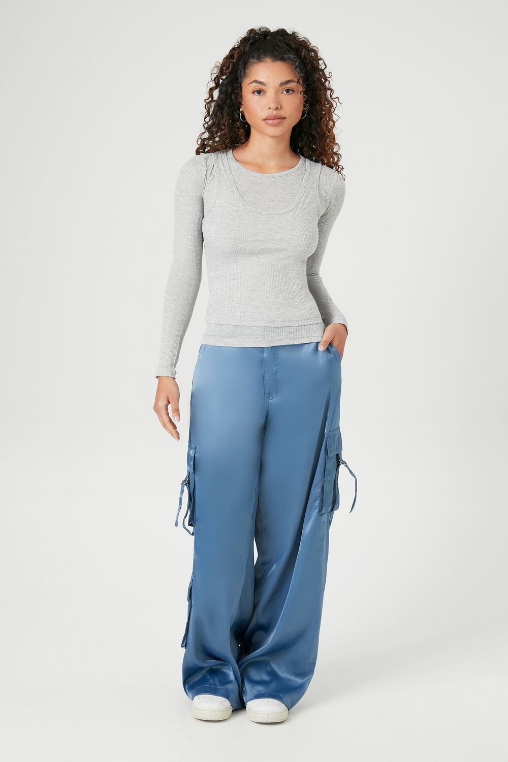 A ribbed knit combo top featuring a round neckline. layered tank design. long sleeves. and a fitted silhouette.