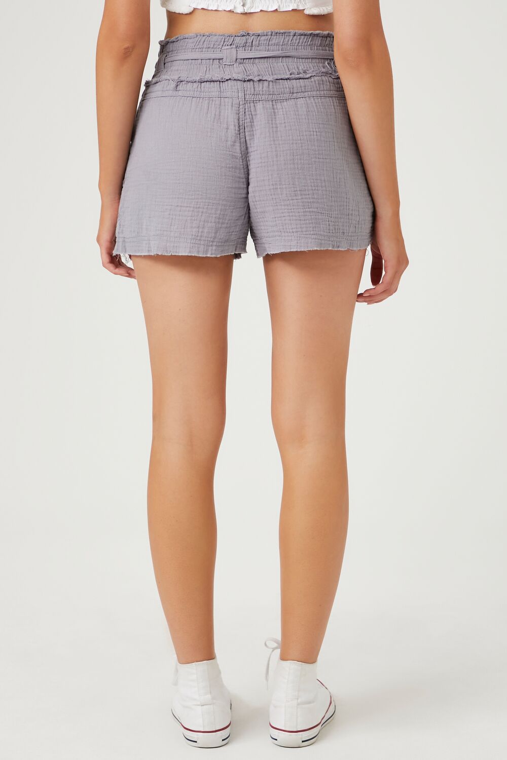 A pair of linen-blend shorts featuring an allover textured construction. high-rise drawstring waist. slanted front pockets. and raw-cut hem.