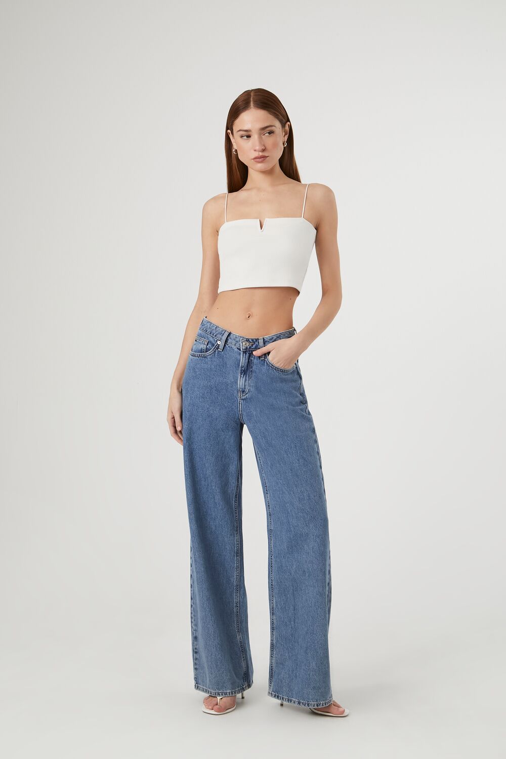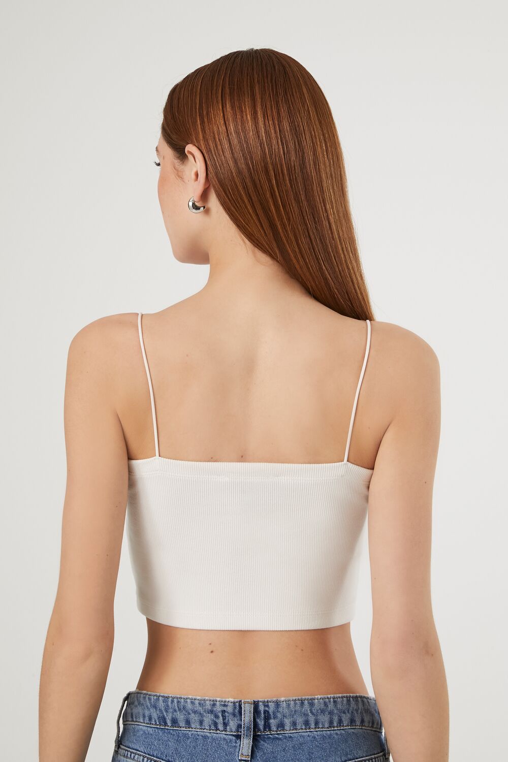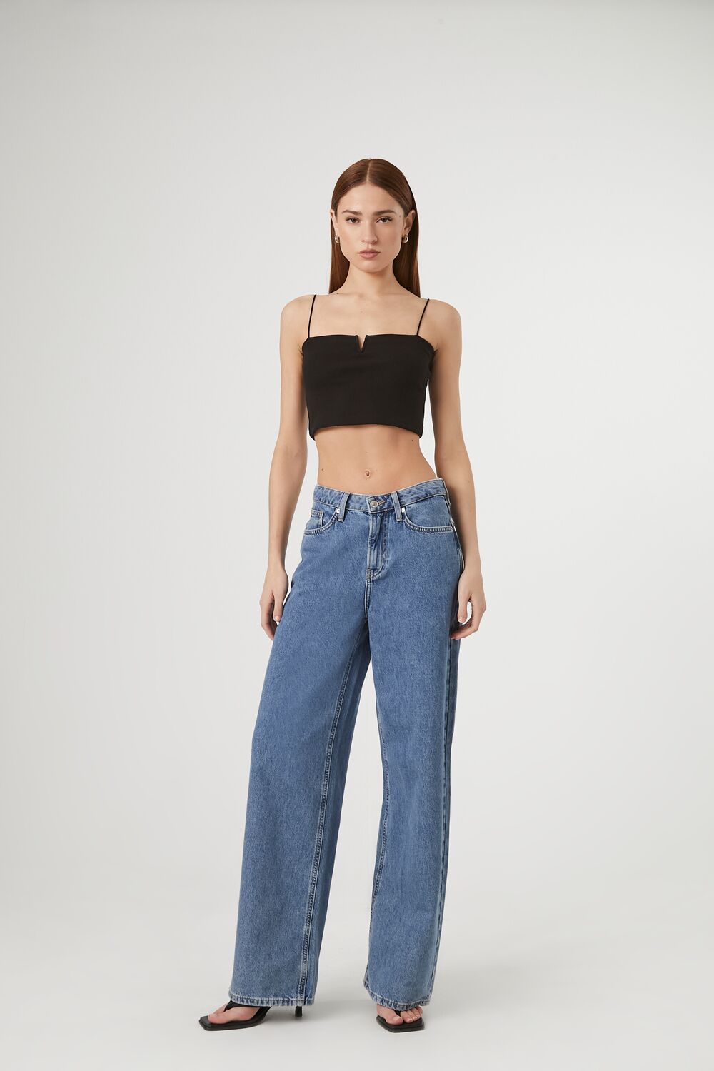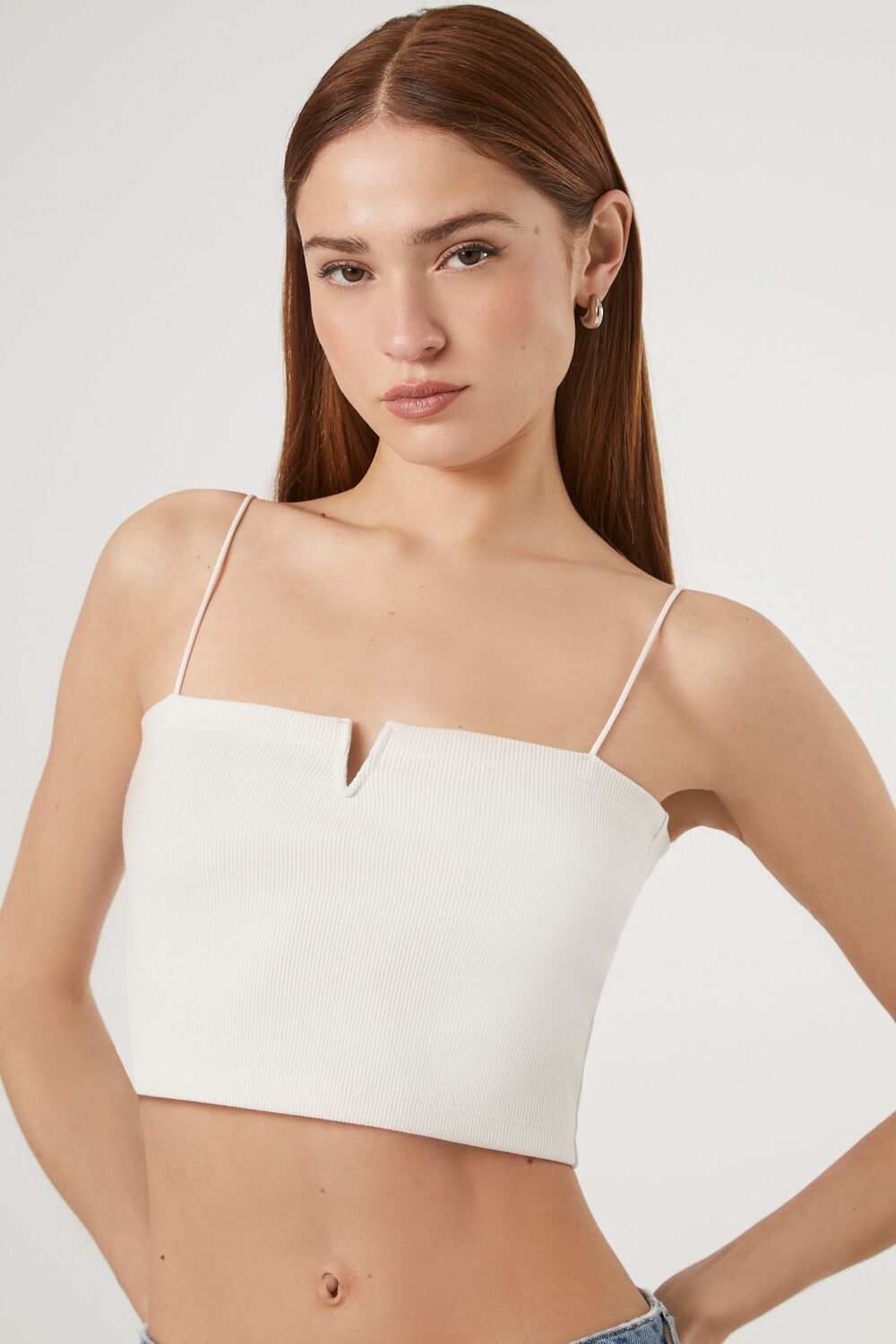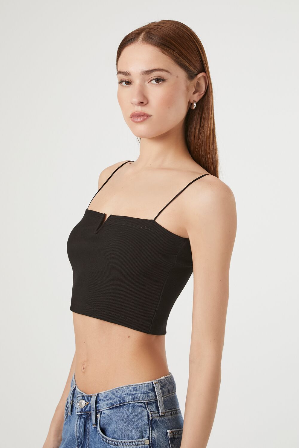 A knit cami featuring a notched neckline. straight-cut back. fixed straps. and a cropped hem.