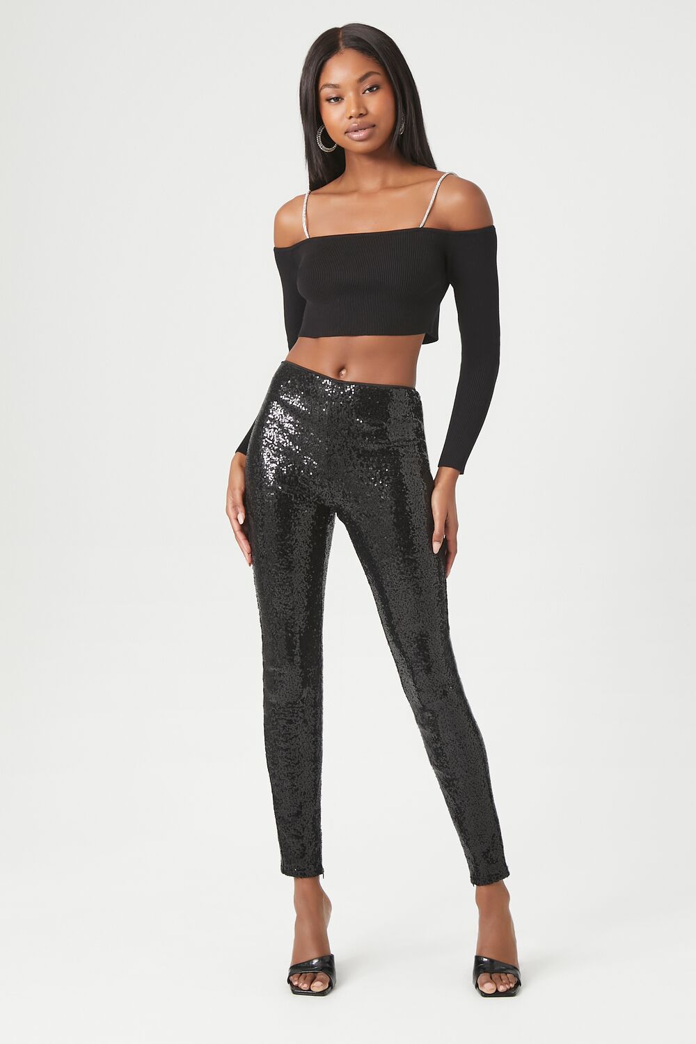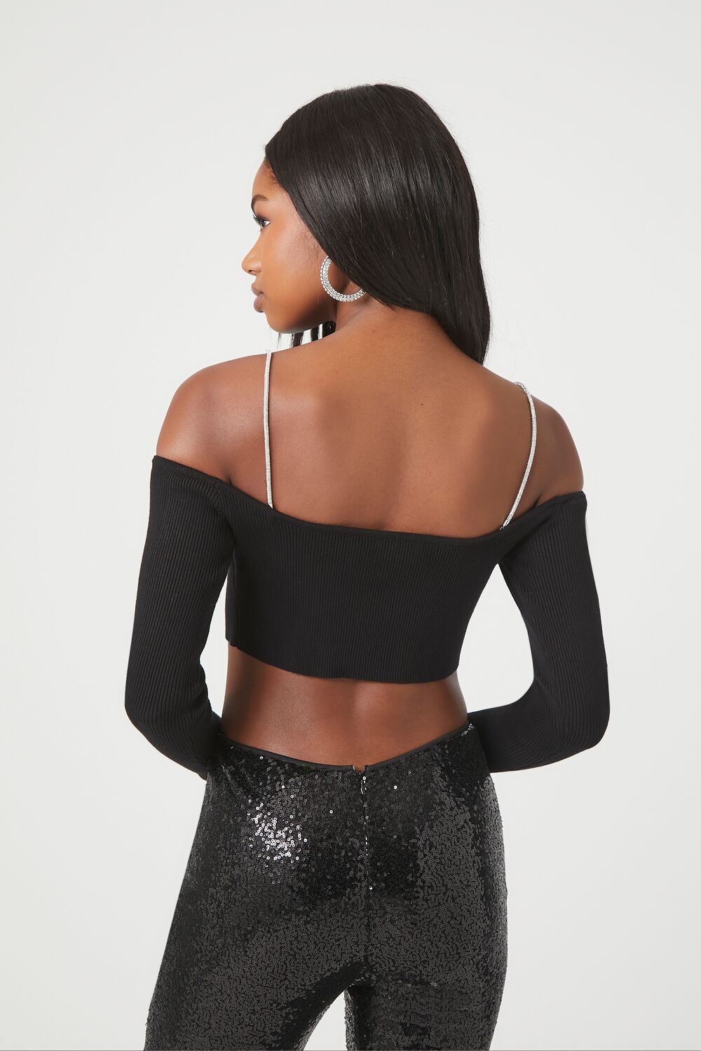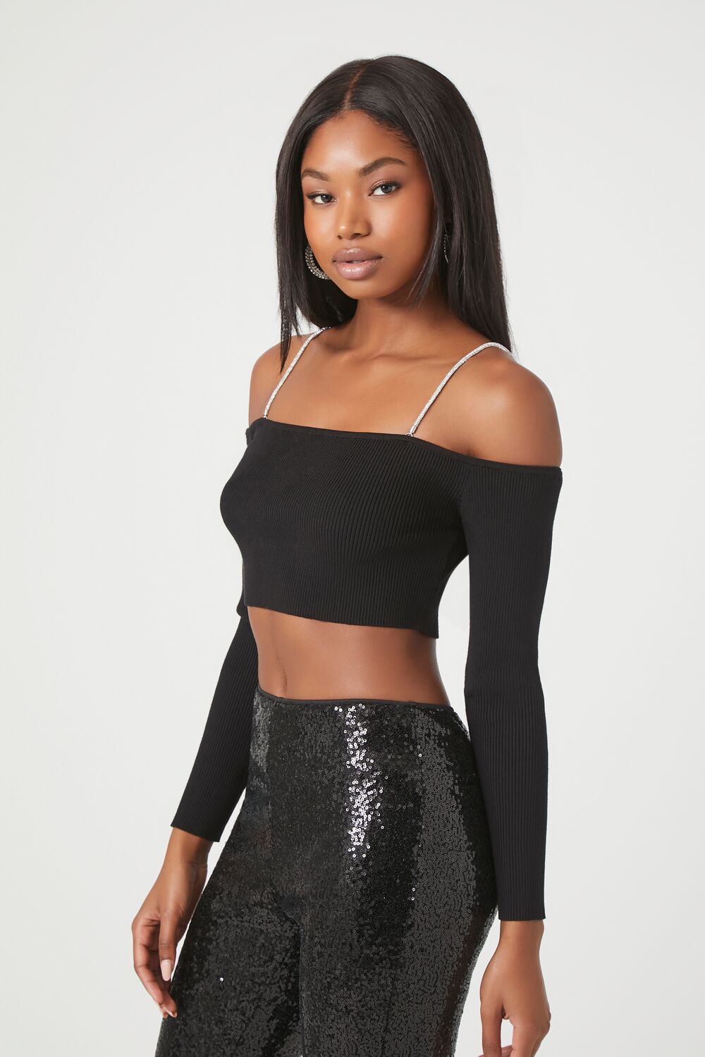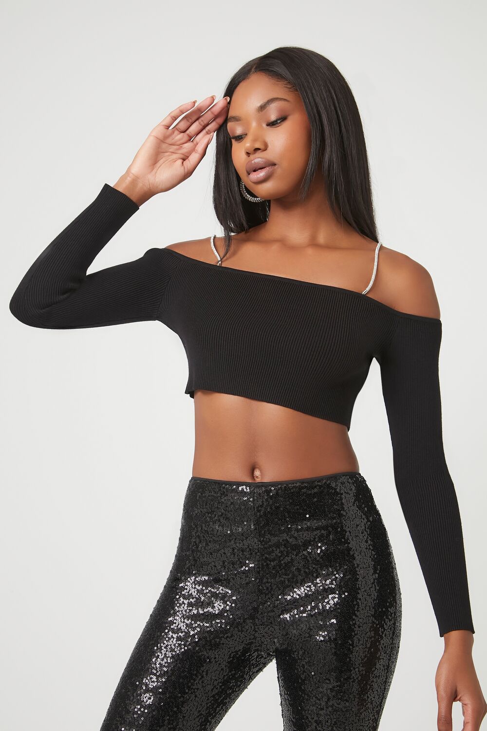 A ribbed knit top featuring an off-the-shoulder neckline. metal straps. long sleeves. and a cropped hem.