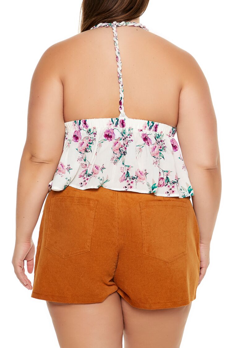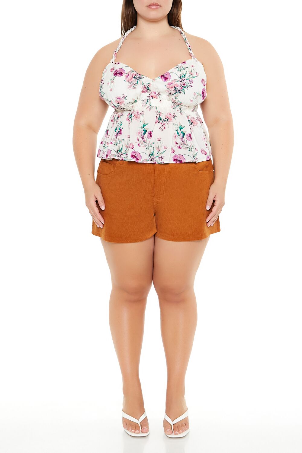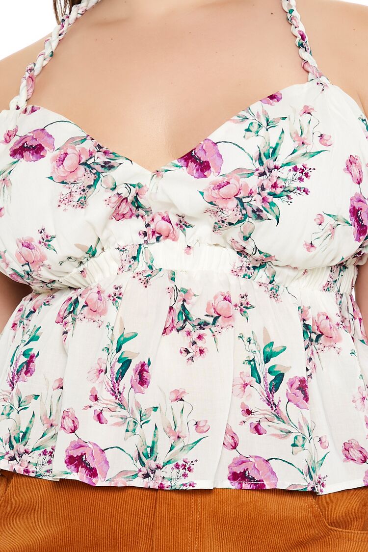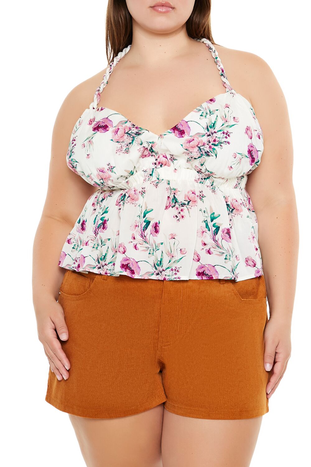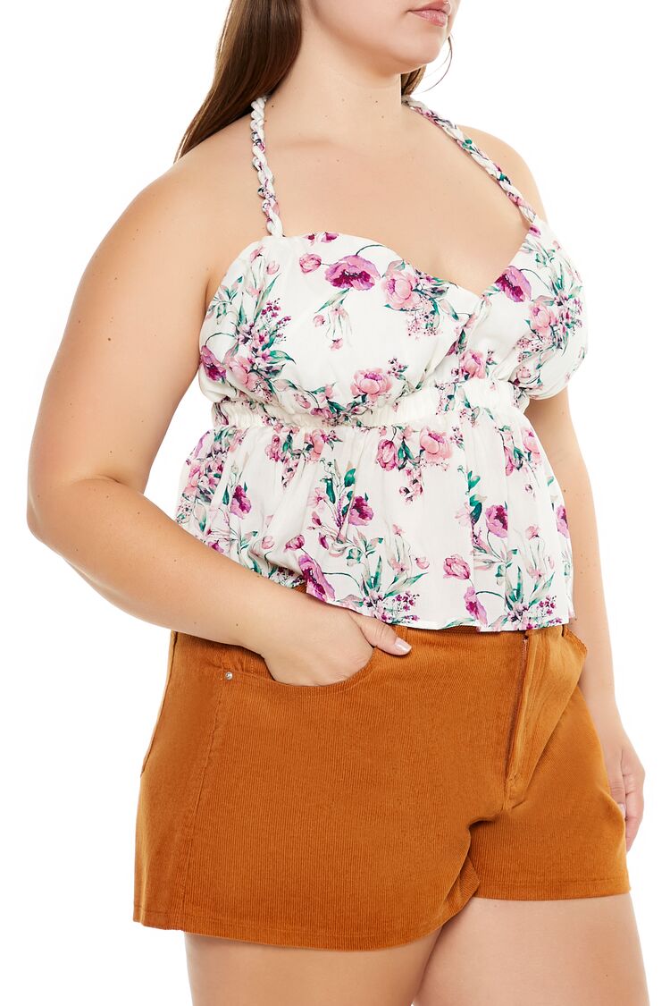 Forever 21+ – A satin cami featuring an allover floral print. sweetheart neckline. elasticized waist. twisted T-back. and cropped flounce hem.