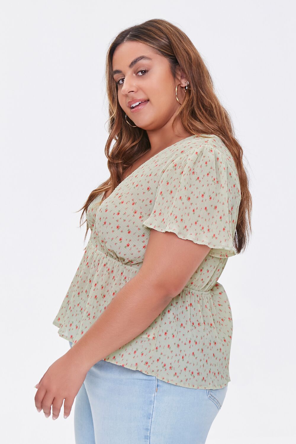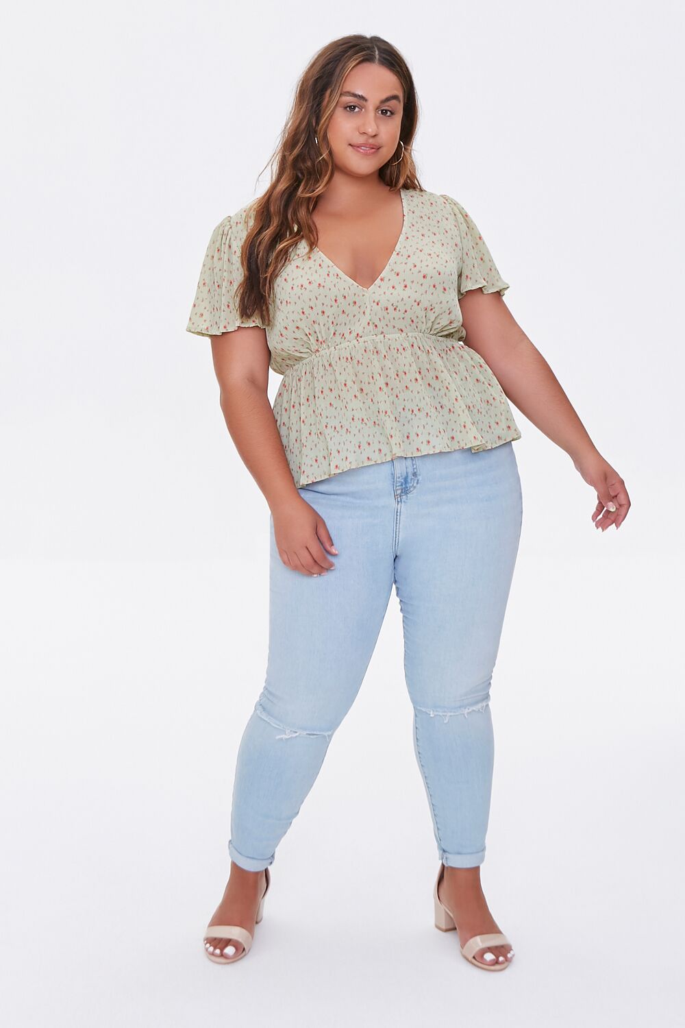 Forever 21+ – A woven top featuring an allover floral print. V-neckline. short flounce sleeves. an elasticized waistband. and a flounce hem.