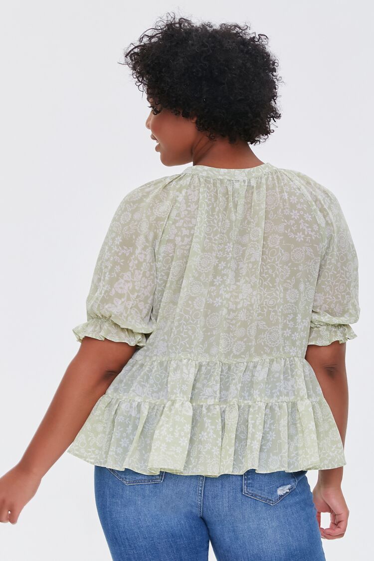 Forever 21+ – A woven top featuring an allover floral print. short sleeves. ruffle trim. and a self-tie round neckline.