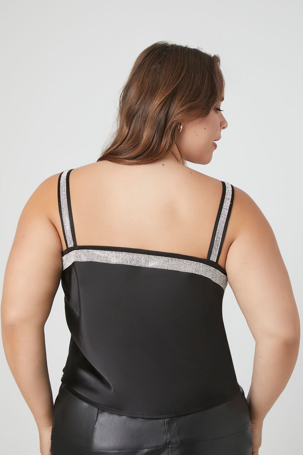 Forever 21+ – A satin tank top featuring rhinestone trim. a square-cut neckline and back. shoulder straps. and cropped hem.