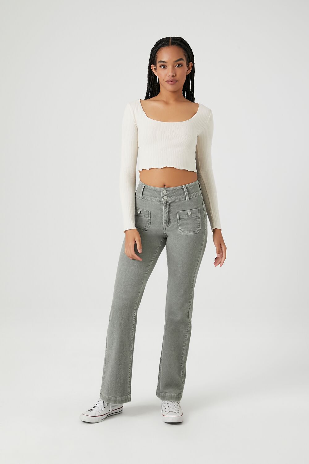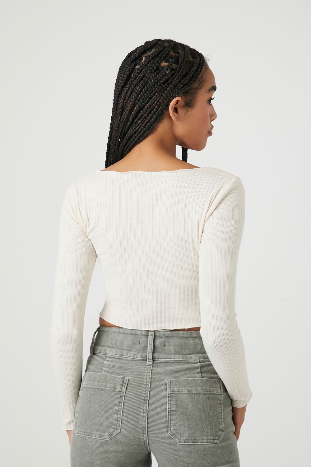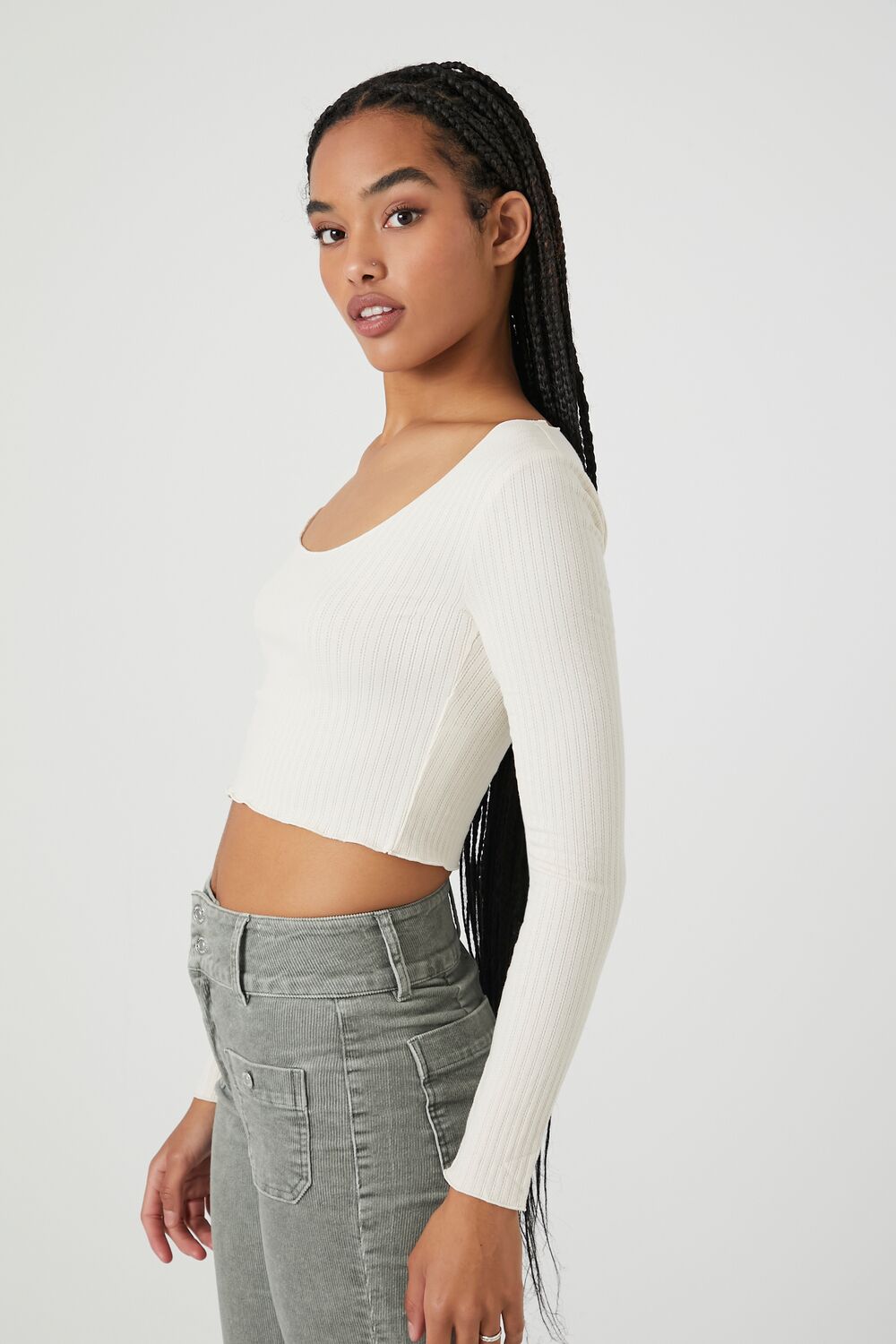A Pointelle knit crop top featuring a round neckline. long sleeves. and lettuce-edge trim.
