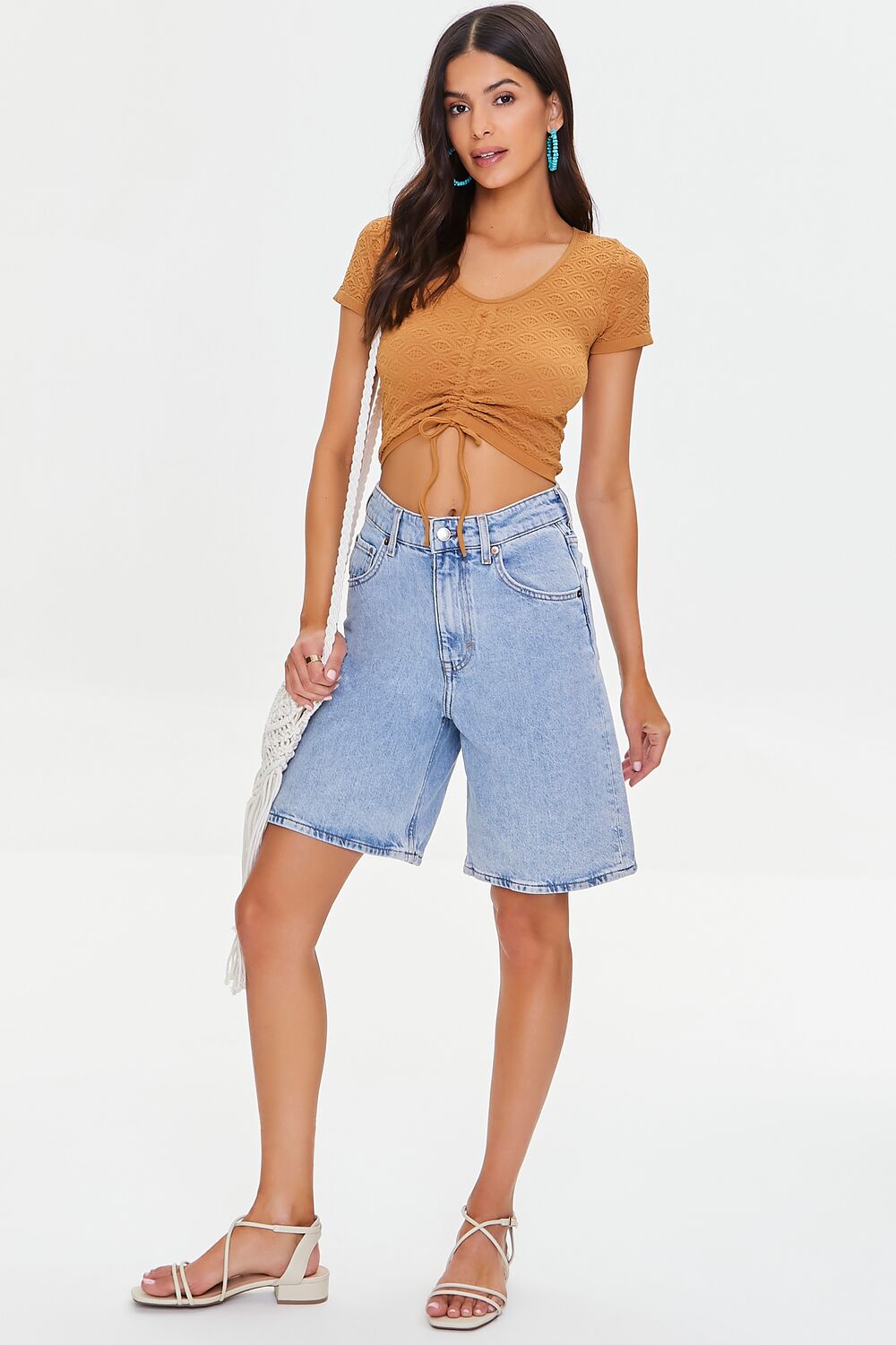 A pointelle knit crop top featuring a ruched drawstring. short sleeves. and a scoop neckline.