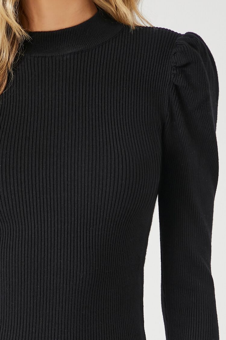 A knit mini sweater dress featuring a round neckline. long puff sleeves. and a bodycon silhouette.