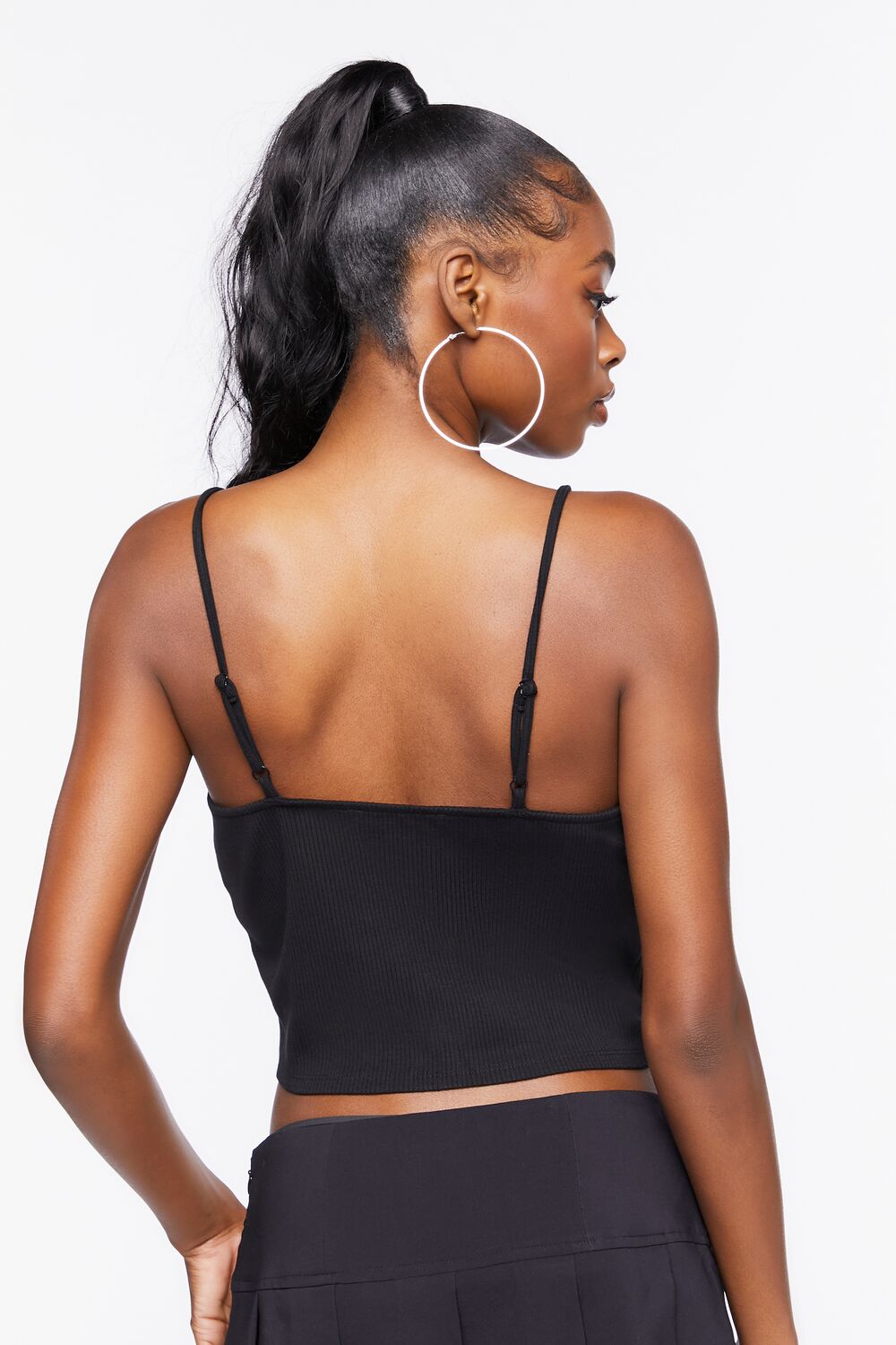 A ribbed knit cami featuring a scoop neck. straight-cut back. front ladder cutouts with rhinestone heart embellishments. and a cropped hem.
