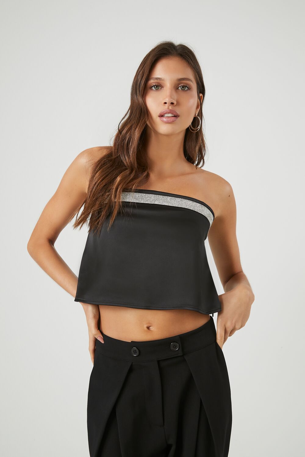 A satin crop top featuring rhinestone trim. strapless cut. straight-cut neckline and back. and a relaxed fit.