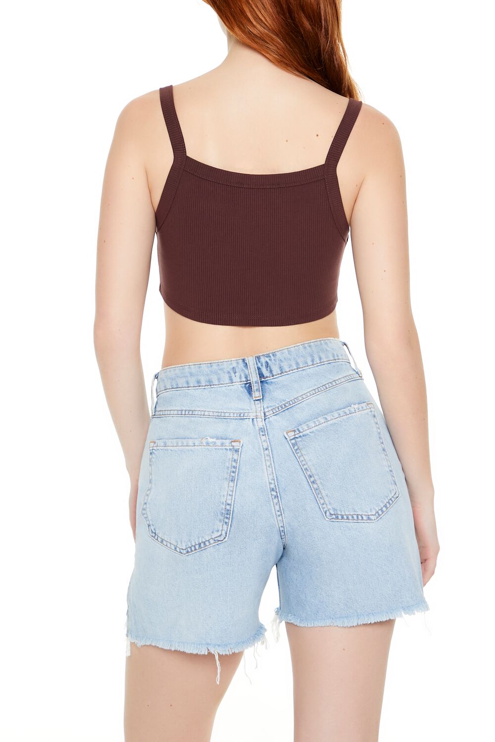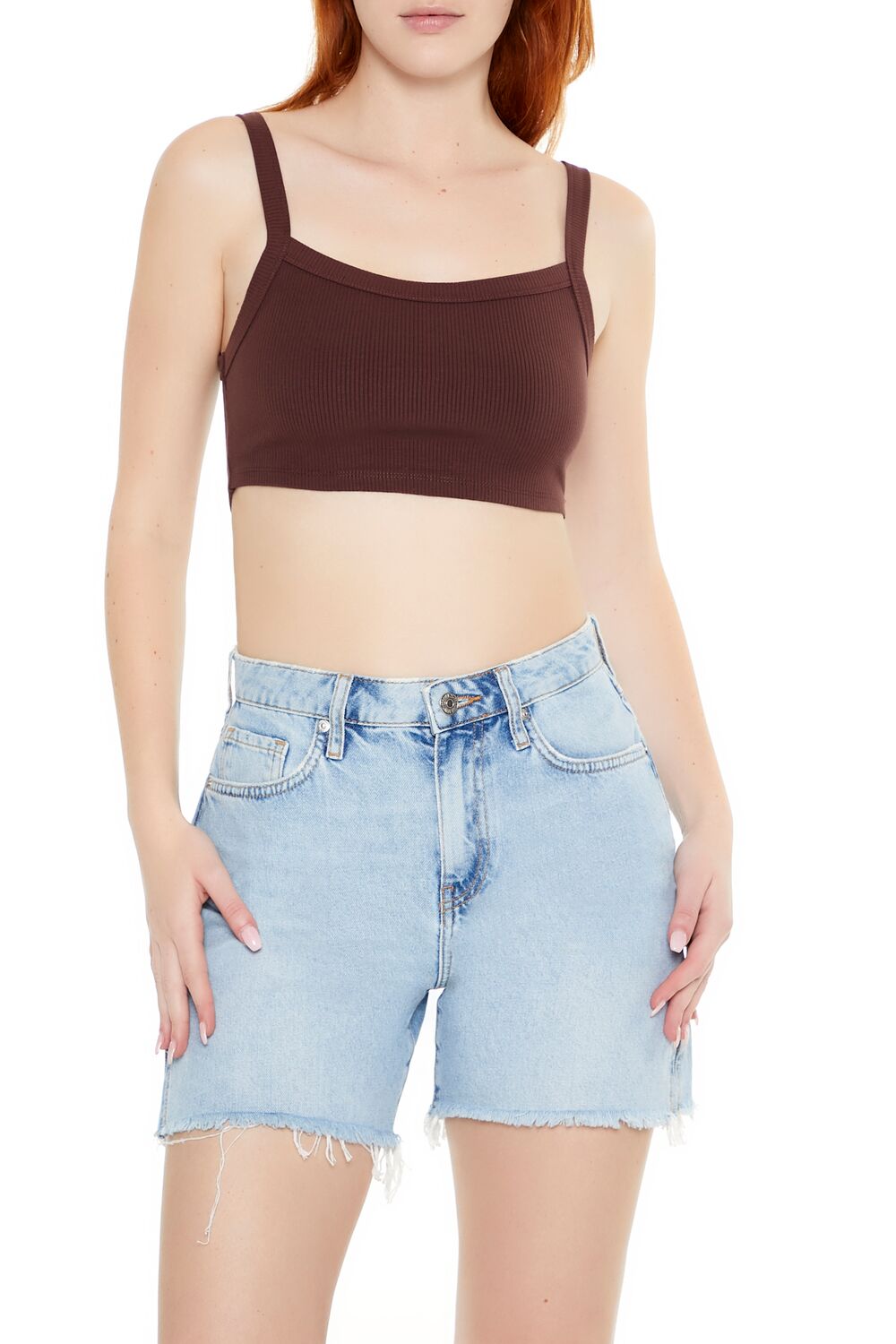 A ribbed knit cami featuring a straight-cut neckline and back. fixed straps. and a cropped hem.