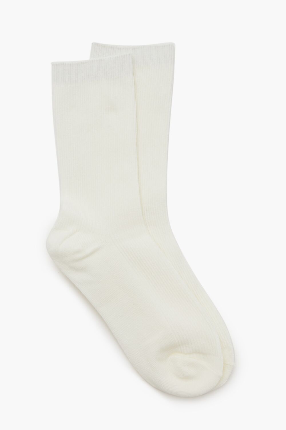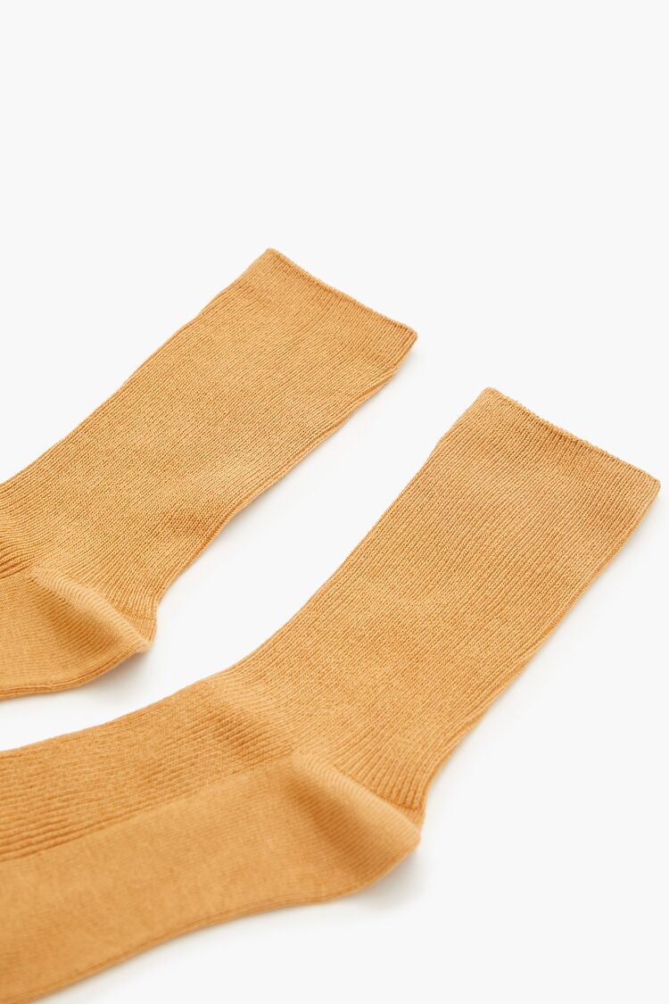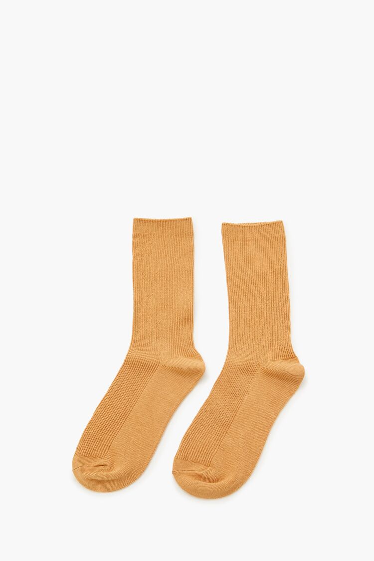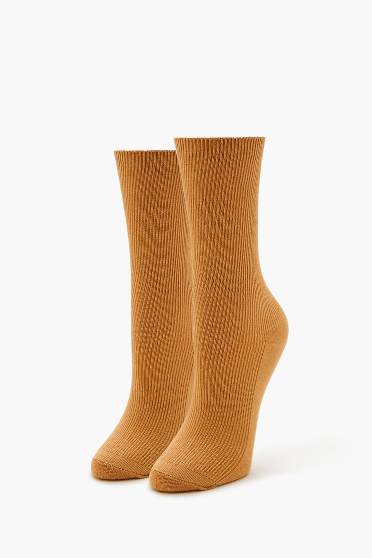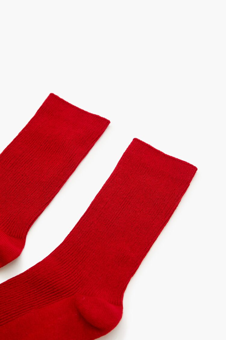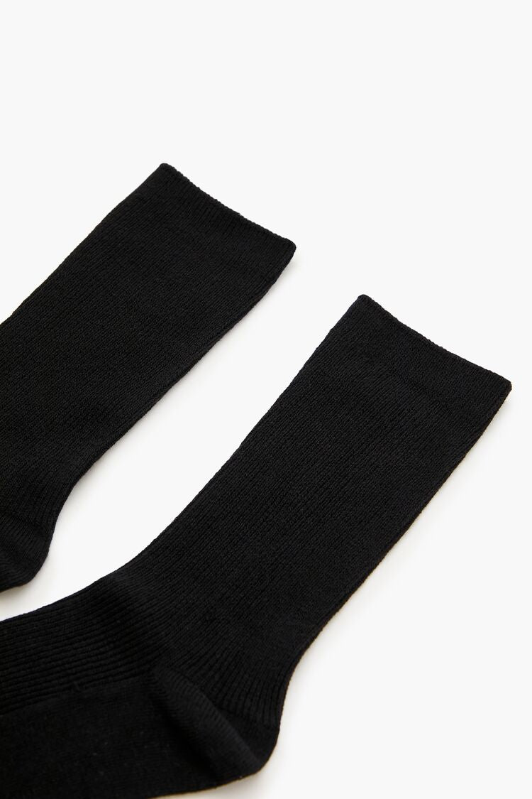 A pair of knit crew socks featuring a ribbed construction.