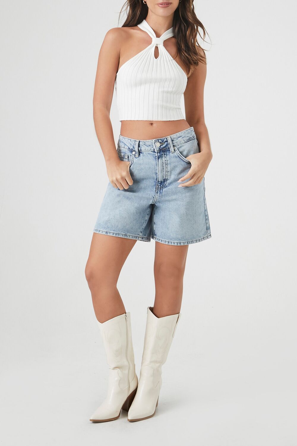 A ribbed knit halter top featuring a front keyhole. knotted chest detail. racerback. and cropped hem.