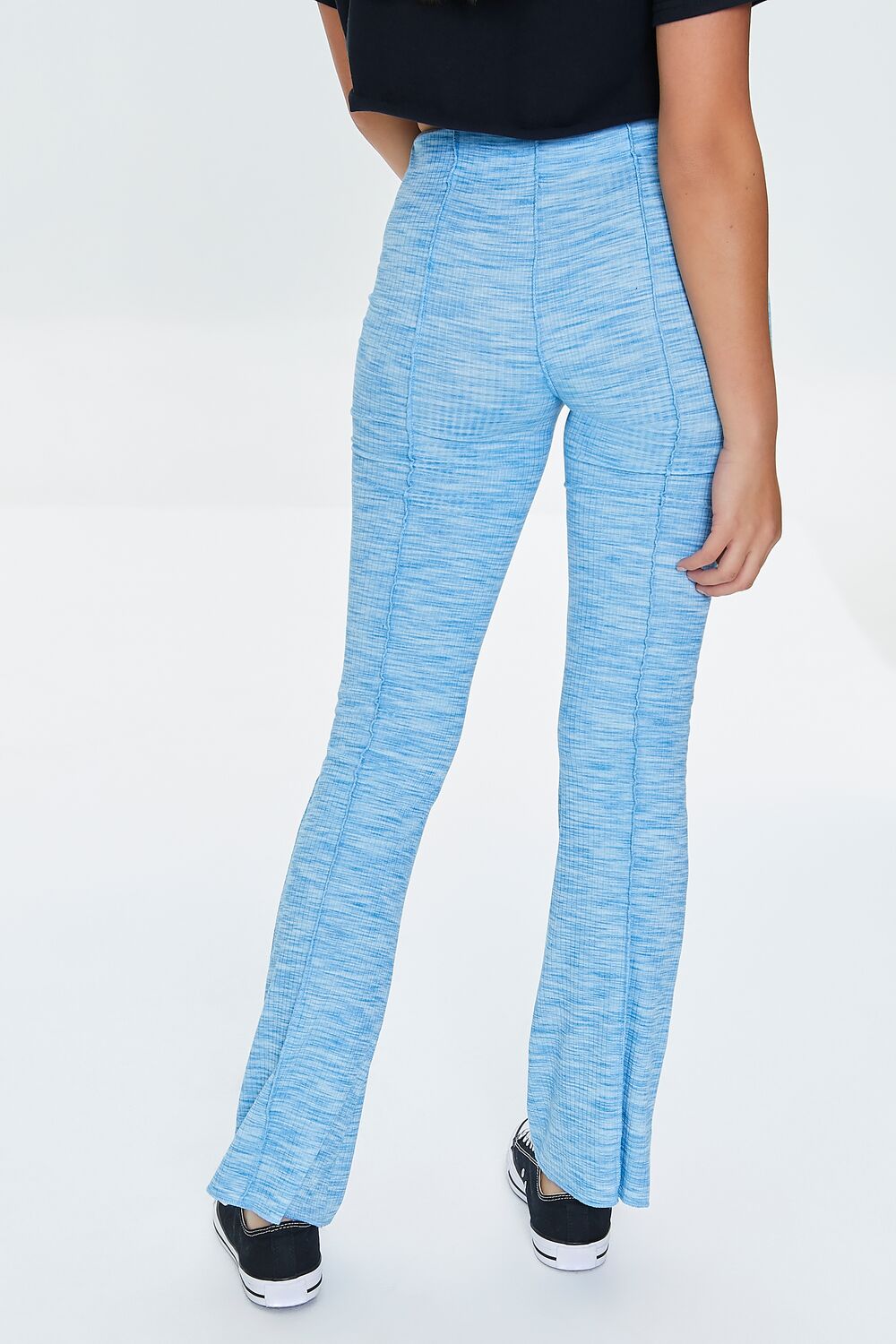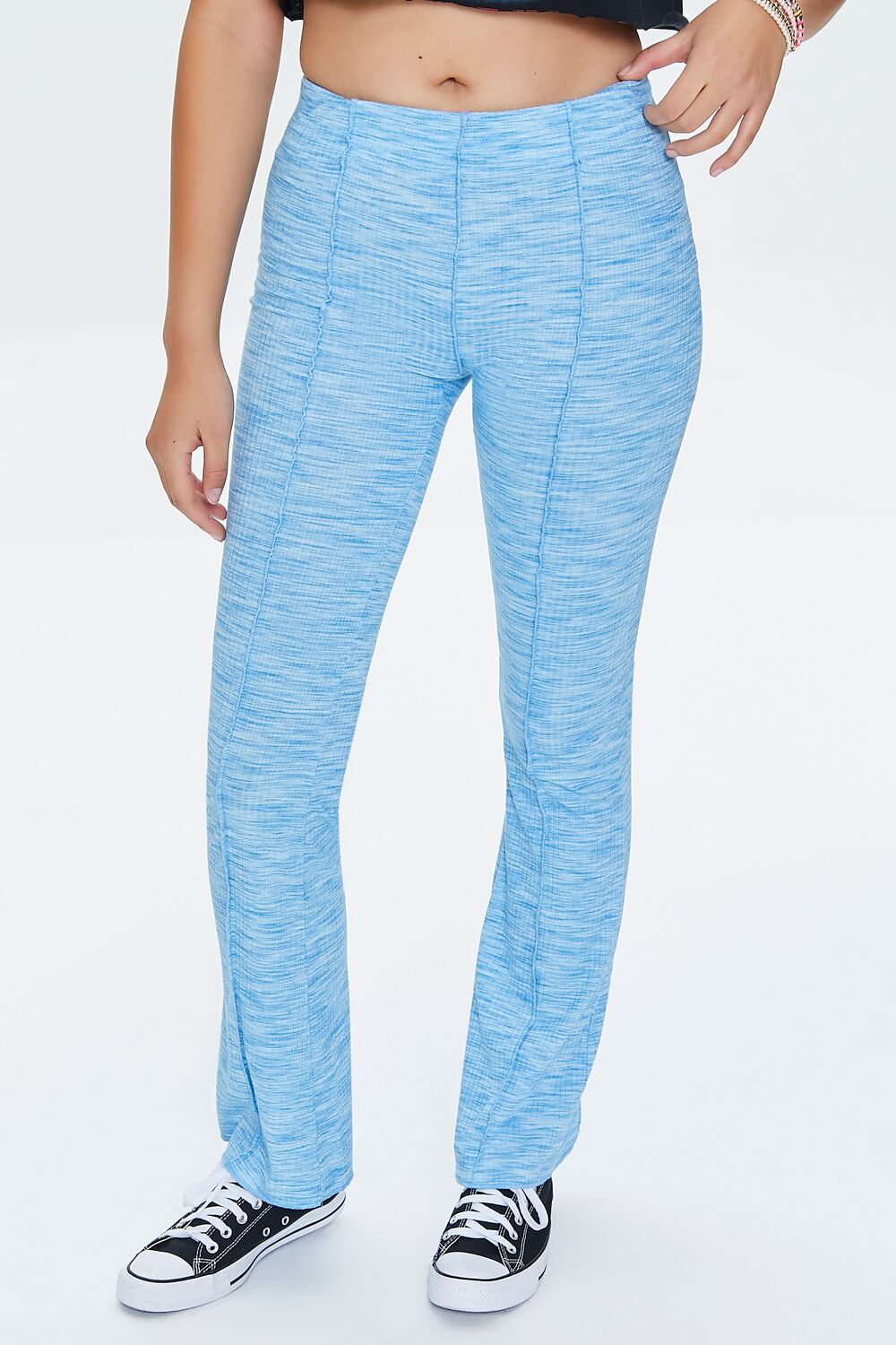 A pair of ribbed knit pants featuring an allover space-dye pattern. reverse seams. and a mid rise.
