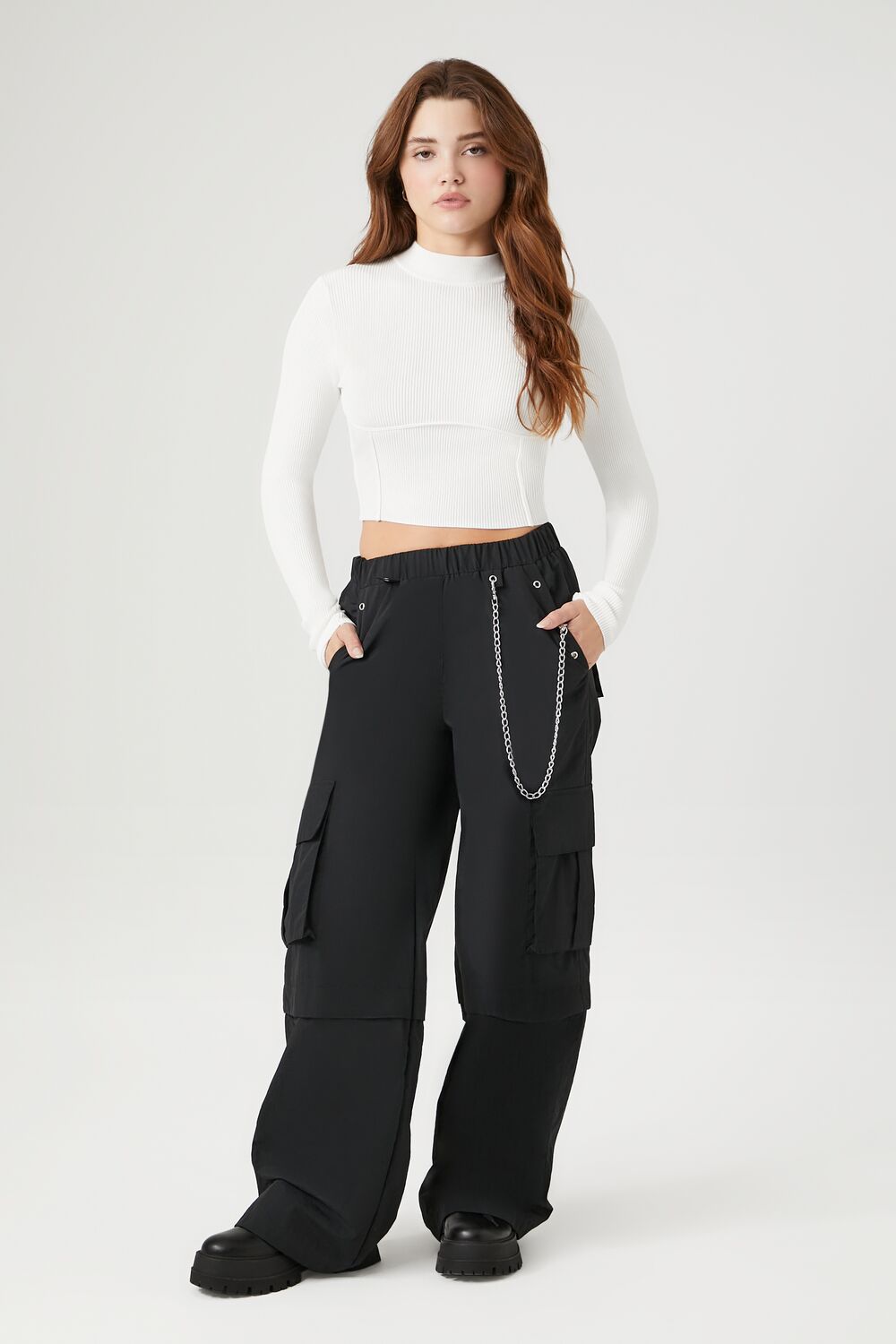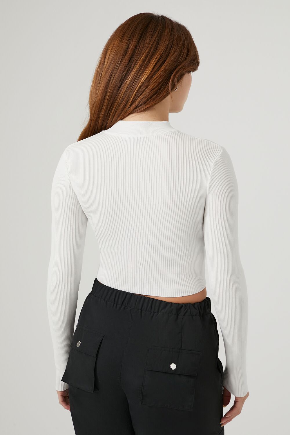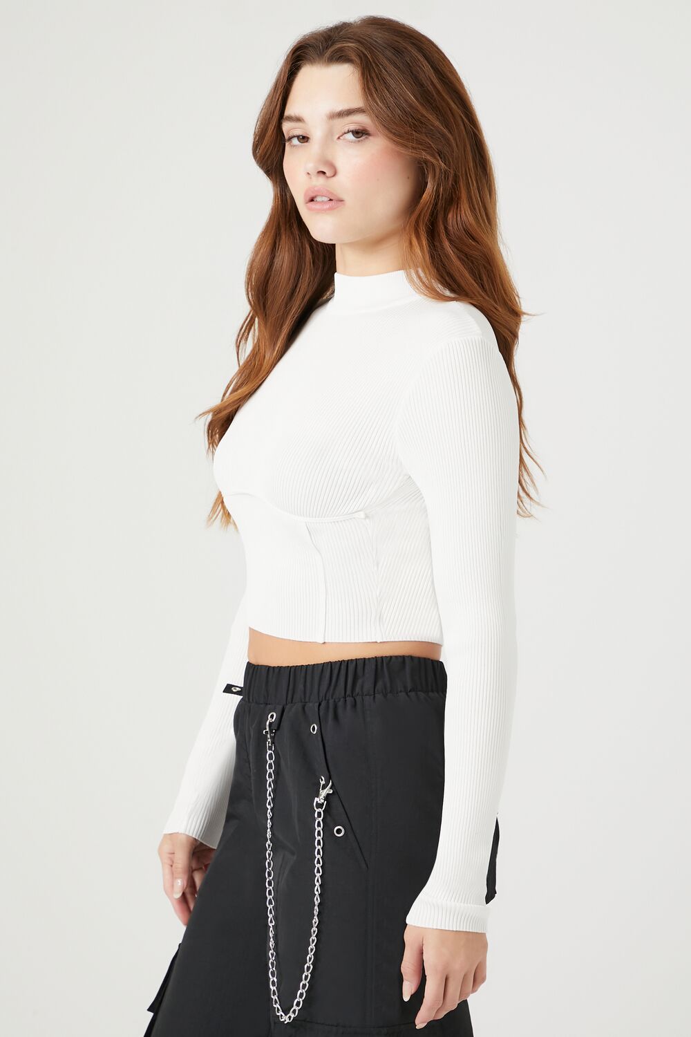 A ribbed knit sweater featuring a mock neck. long sleeves. fitted silhouette. seamed front construction. and a cropped hem.