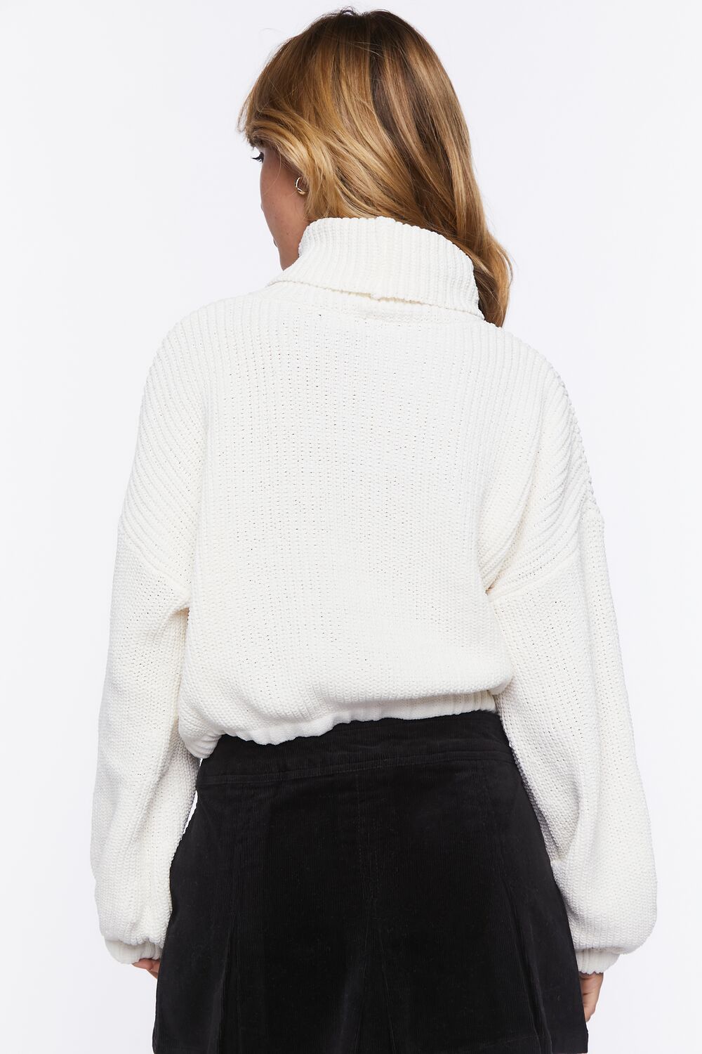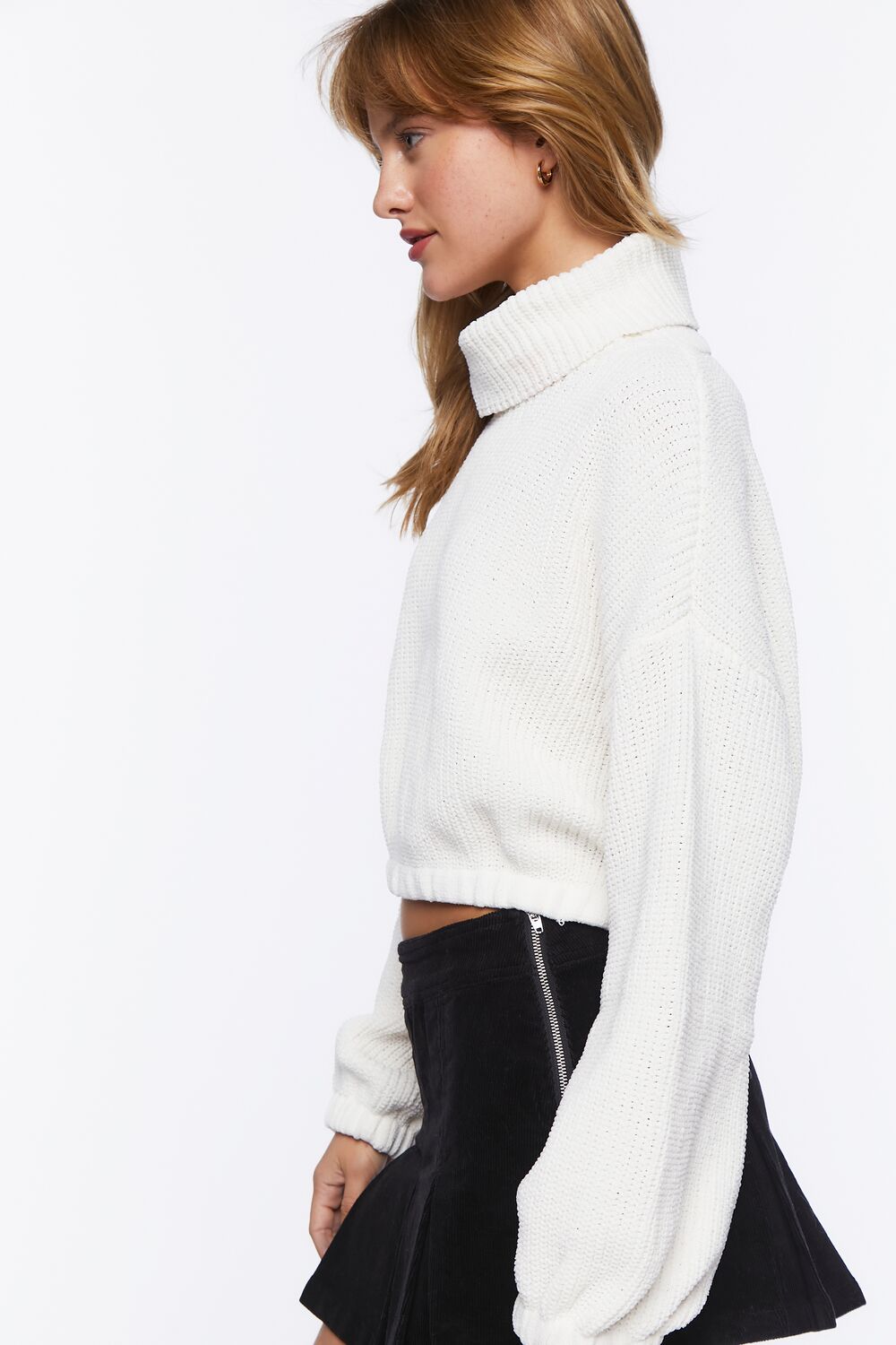 A ribbed knit sweater featuring a turtleneck. dropped shoulders. long balloon sleeves. elasticized trim. and a semi-cropped hem.