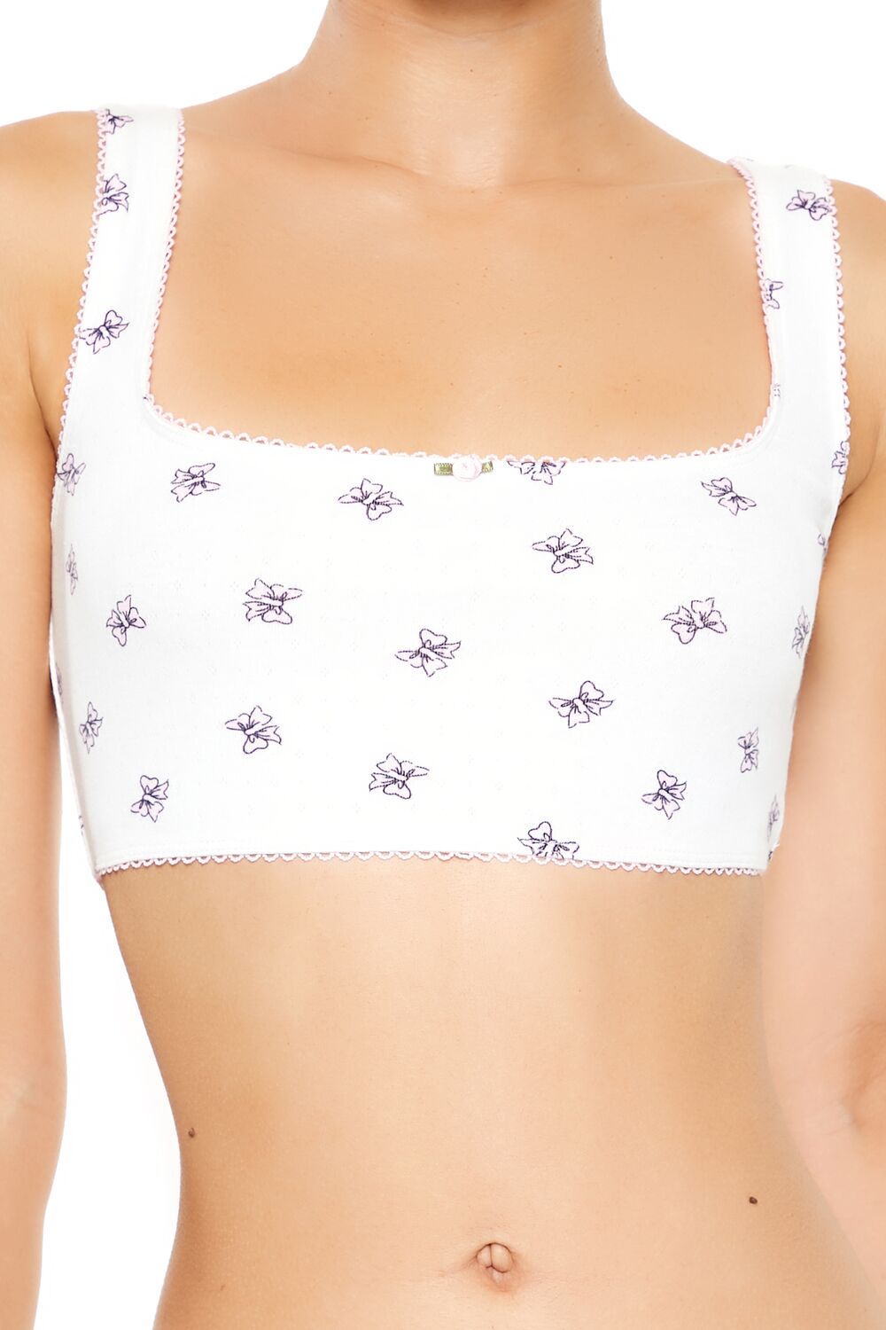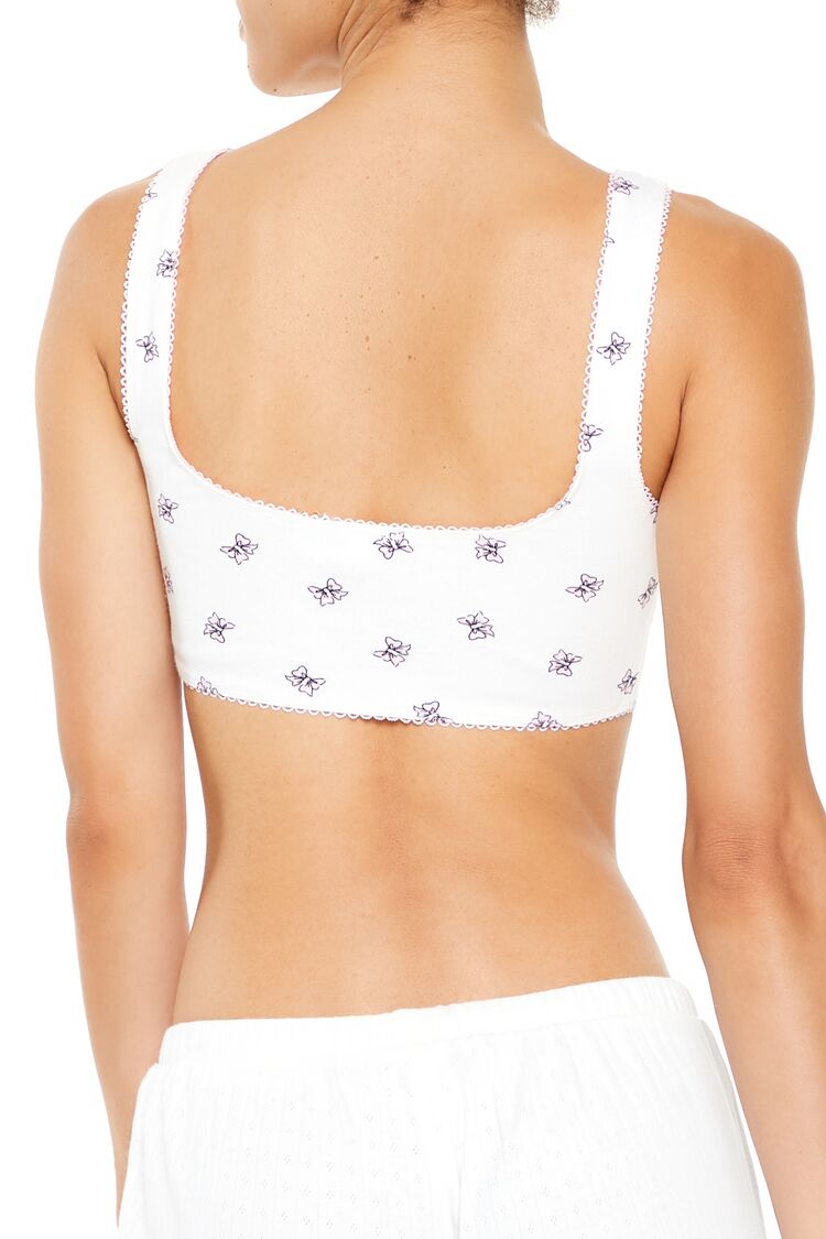A knit bralette featuring picot trim. an allover bow print. square neckline and back. rosette chest applique. and longline hem.