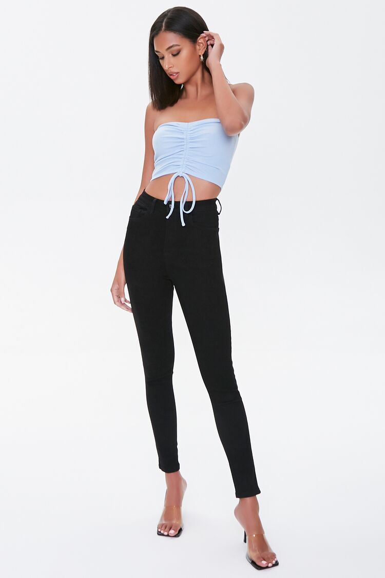 A ribbed knit tube top featuring a strapless cut. ruched front drawstring. and a semi-cropped hem.