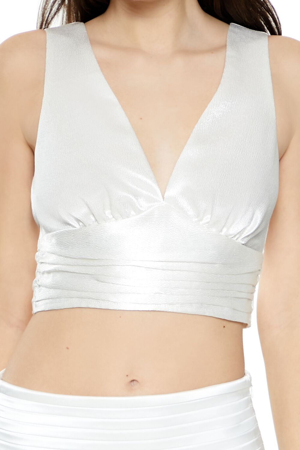 A satin crop top featuring a plunging neckline and back. self-tie support strap and statement bow. and pintucked hem.