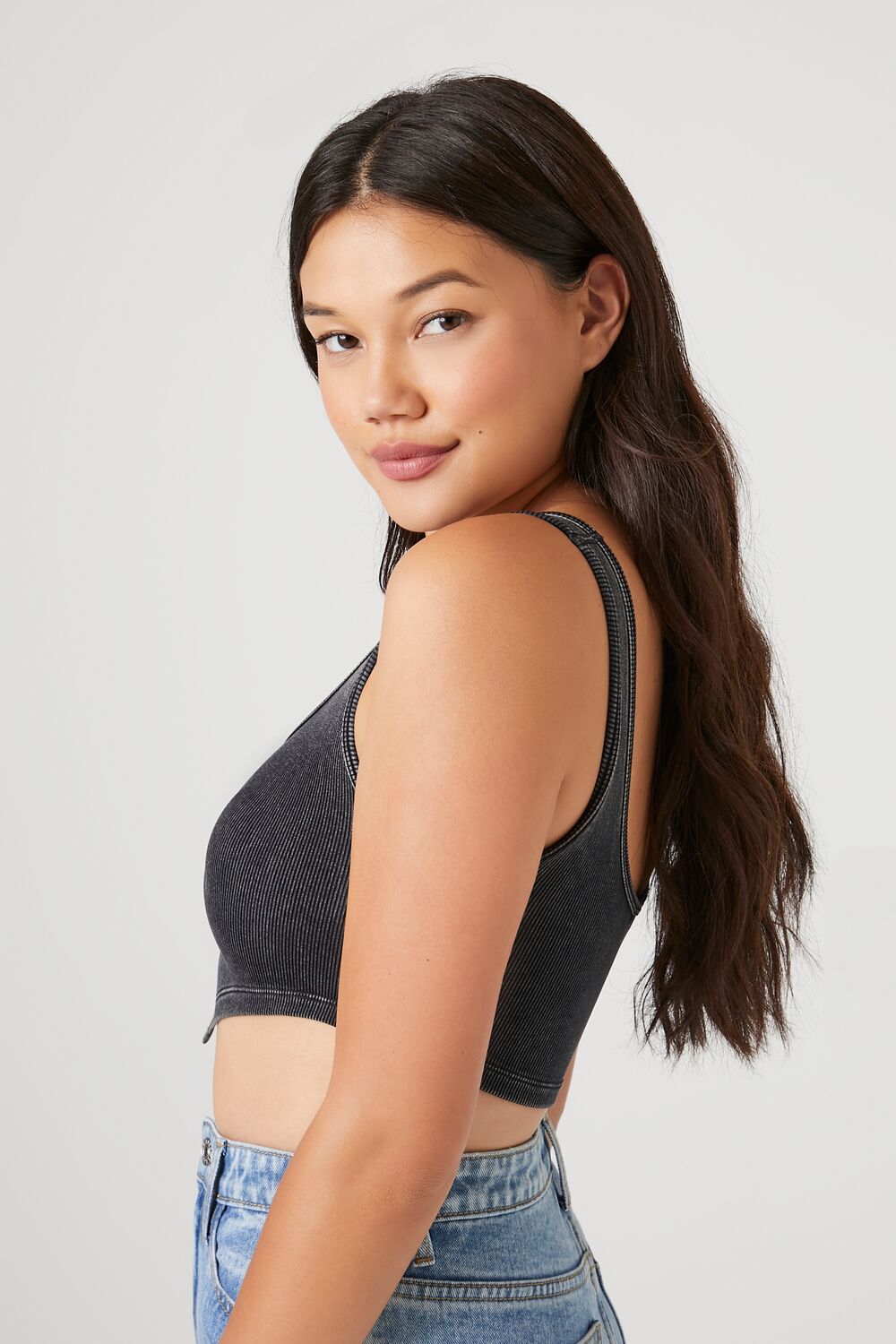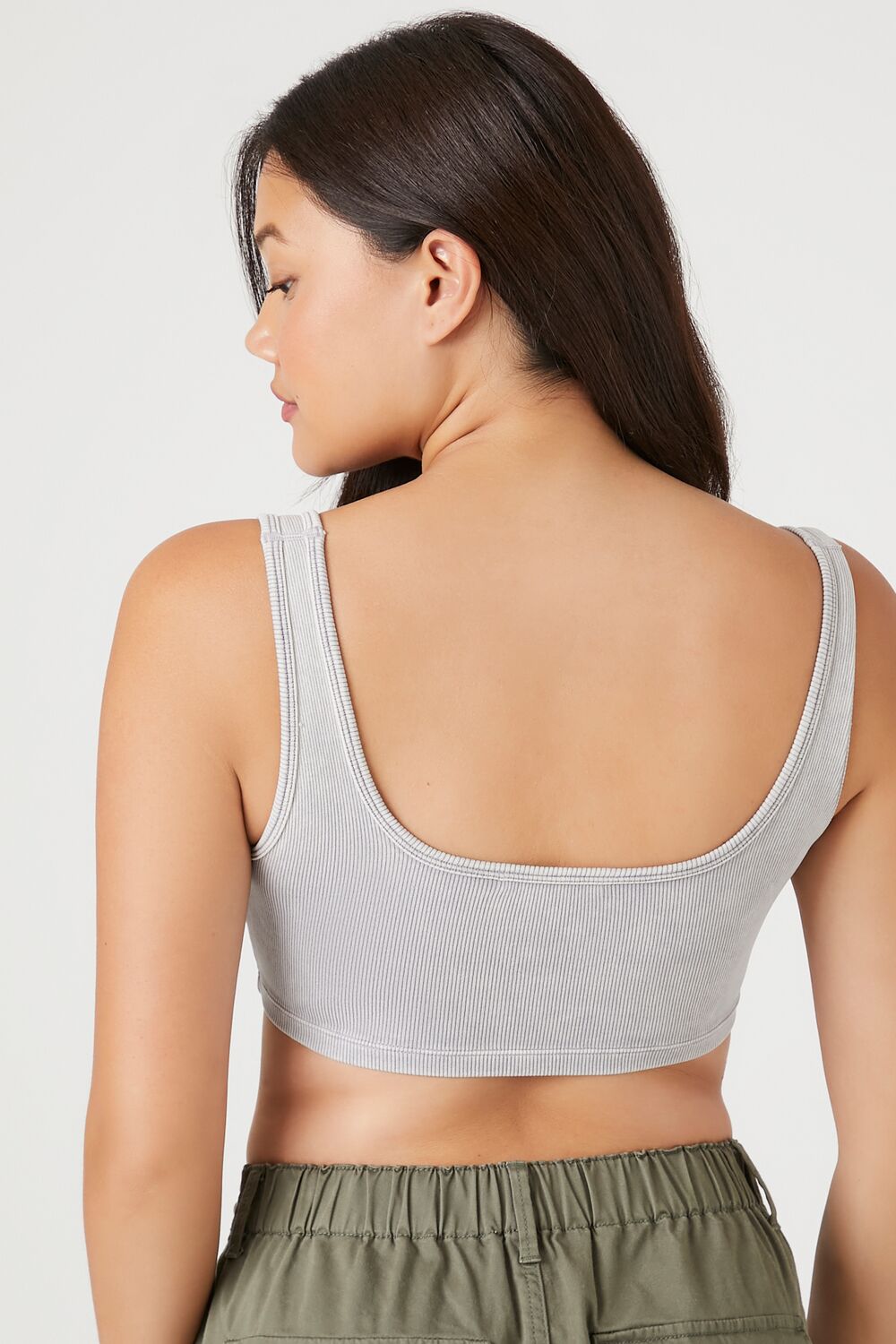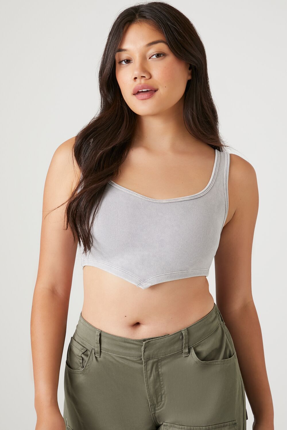 A seamless knit tank top featuring a ribbed construction. scoop-cut neckline and back. shoulder straps. and a cropped V-hem.