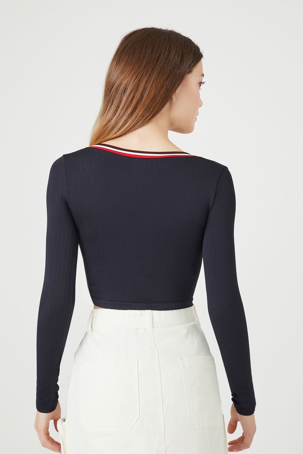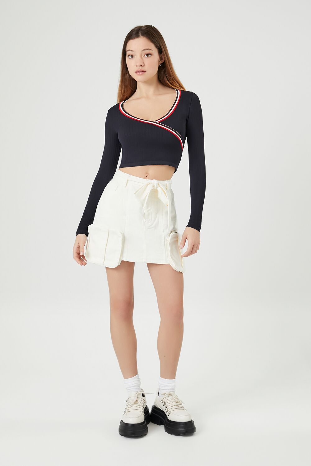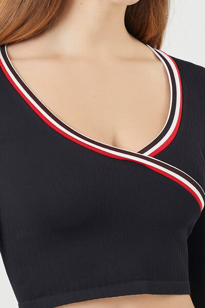 A seamless knit crop top featuring a surplice neckline. striped trim. and long sleeves.