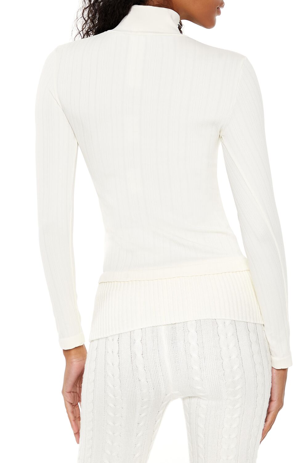 A seamless knit top featuring an allover ribbed construction. turtleneck. and long sleeves.