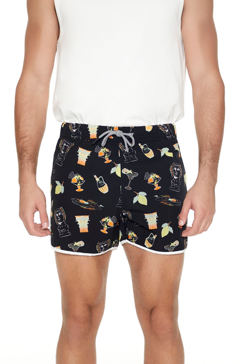 A pair of nylon-blend swim trunks featuring a short 4′ inseam. allover food and drink motif. a drawstring waistband. contrasting ringer trim. dolphin hem. and a back welt pocket.