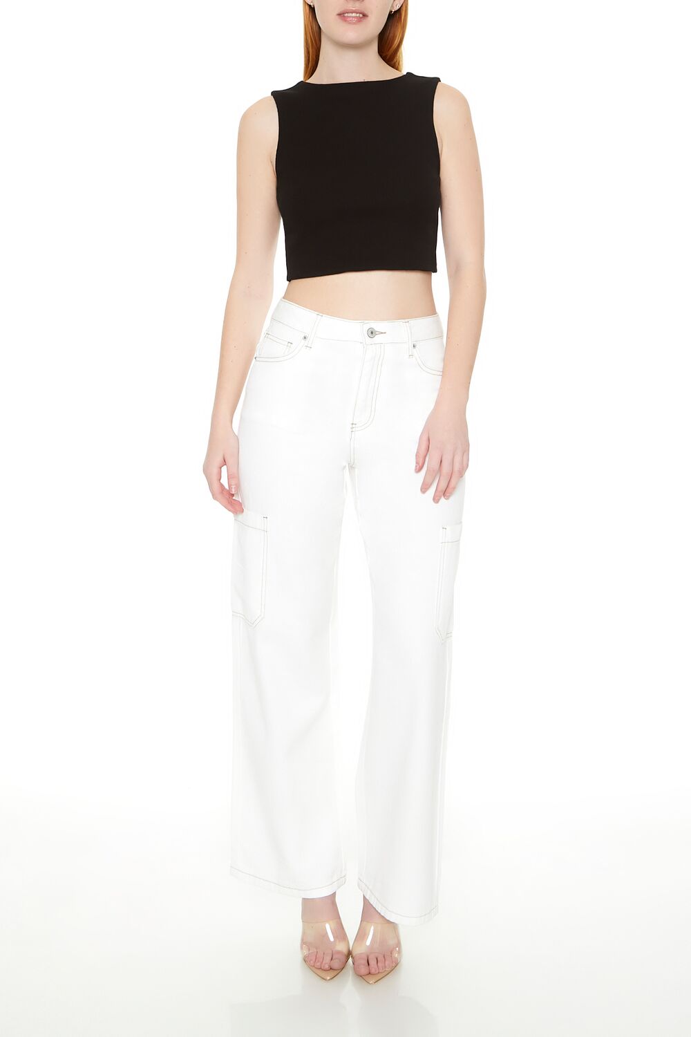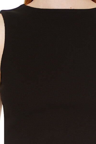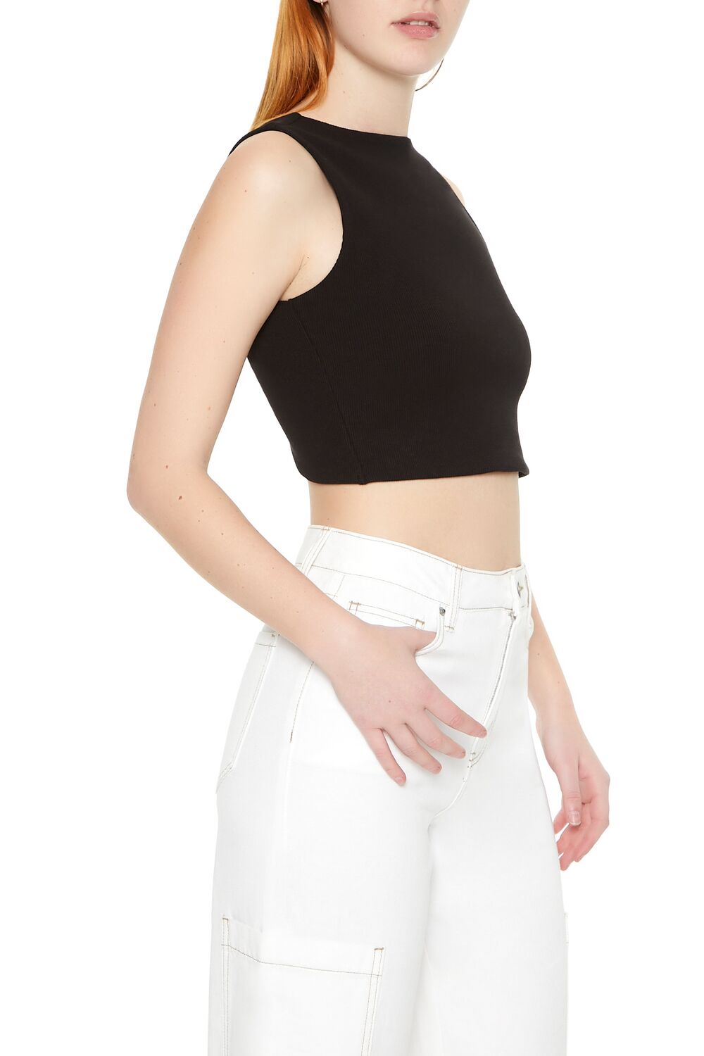 A knit crop top featuring a high neckline. sleeveless cut. plunging back cut. twisted back design. and a notched hem.