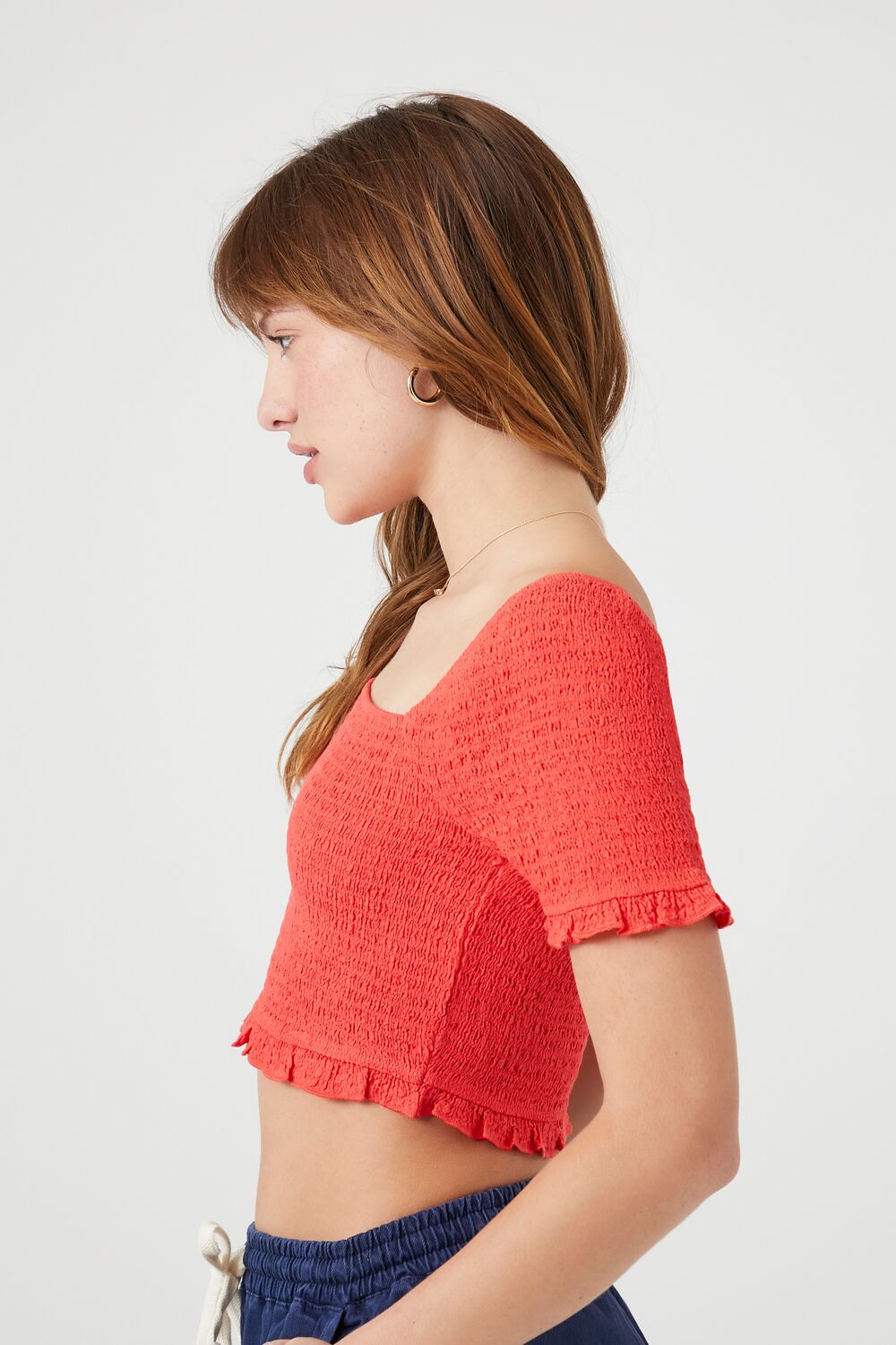 A crepe crop top featuring an allover smocked construction. square-cut neckline and back. short sleeves. and ruffle trim.