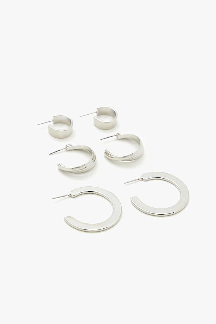 A set of high-polish hoop earrings featuring thick and multi-hoop designs. a smooth finish. open-ended construction. and post-back closures.