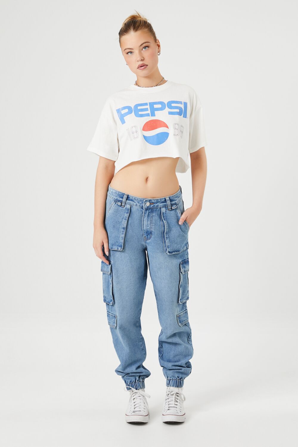 A pair of stretch-denim joggers featuring slant front pockets. cargo leg pockets. belt loops. elasticized ankle trim. and intentional fading.