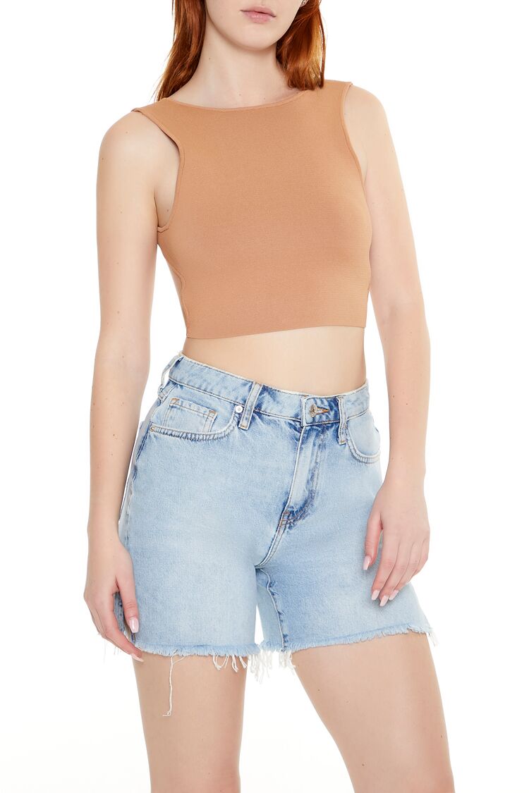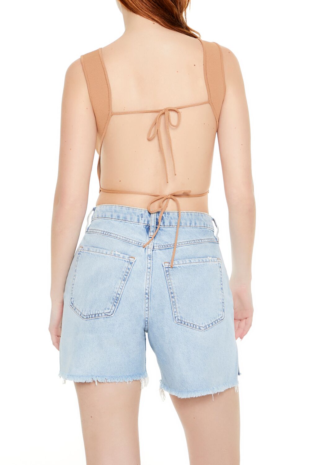A sweater-knit crop top featuring a round neckline. sleeveless cut. and an open back with self-tie back closures.